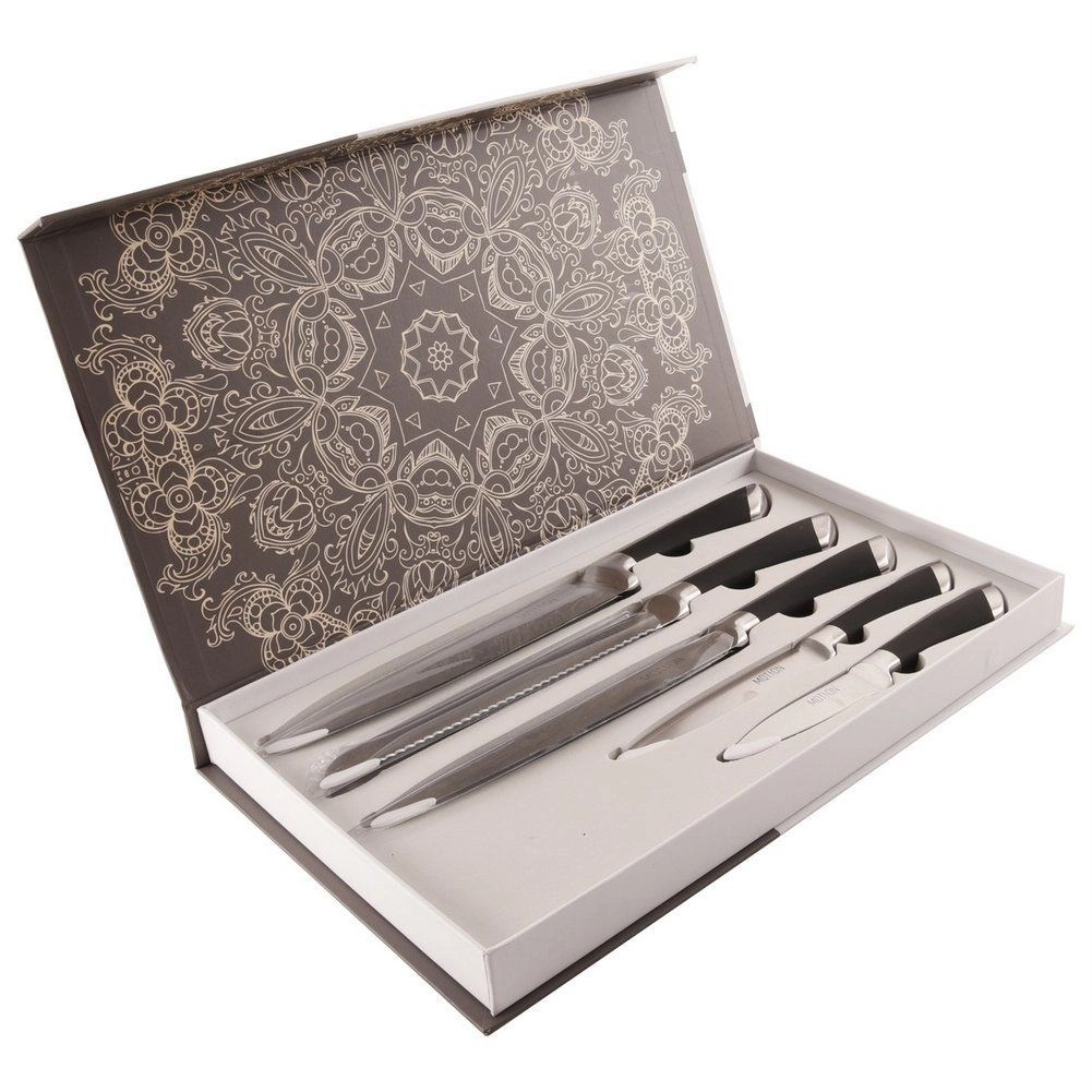 A csomagban öt különböző hosszúságú kést talál a gyümölcsök, zöldségek, húsok és kenyér pontos és hatékony szeleteléséhez. Időtálló, klasszikus dizájn, amely bármely konyhába illik, a készlet ráadásul kiváló ajándék is. Eredeti, ORION márkájú termék, európai szabványok szerint gyártva.