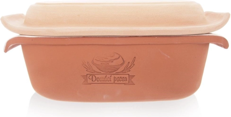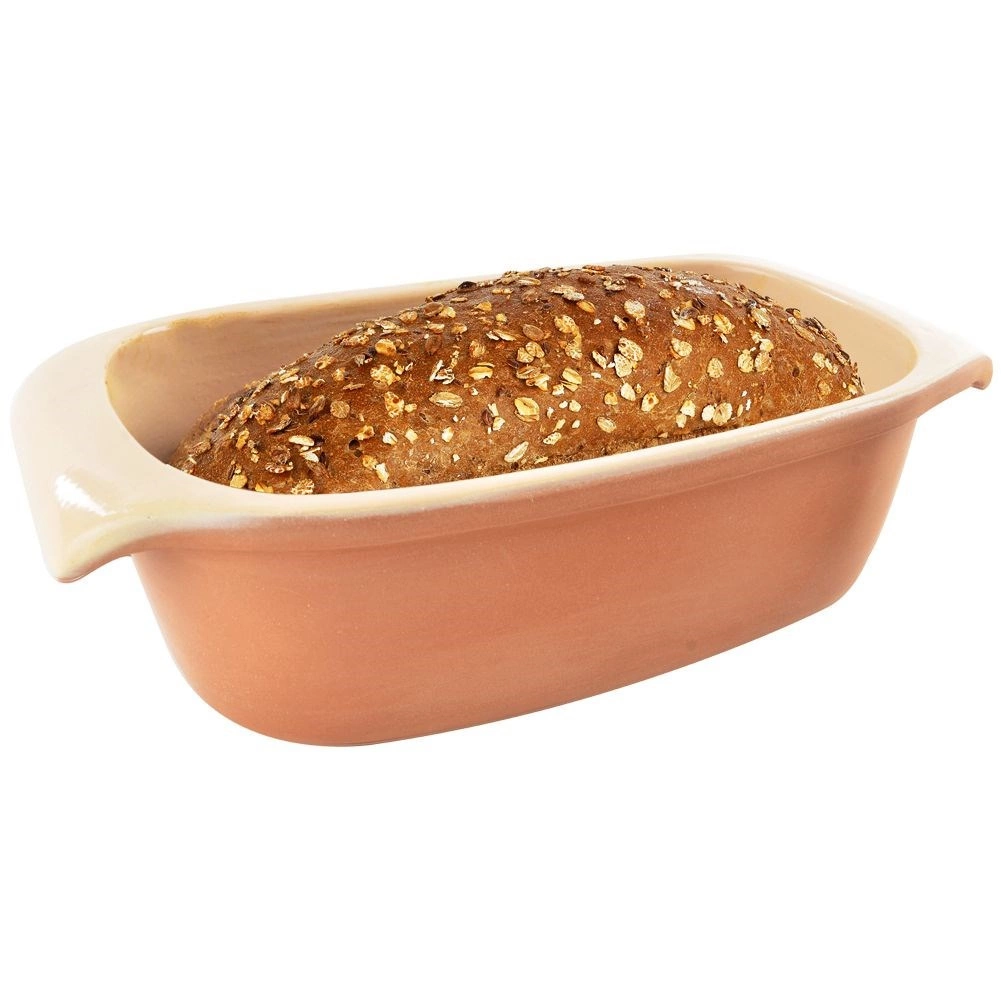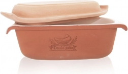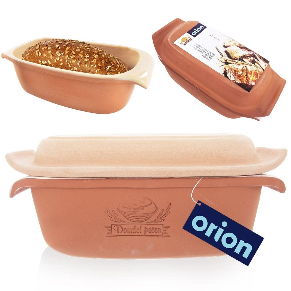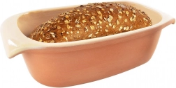 Praktikus kerámia kenyérsütő forma fedővel, 33 × 16 × 16 cm méretben, 2,7 l űrtartalommal, amely egyenletes átsülést és ropogós héjat biztosít. A természetes kerámiának köszönhetően kiválóan vezeti a hőt, így a sütés energiatakarékos és egyenletes. A formának mázas belső felülete van a könnyű tisztítás érdekében, kényelmes fogantyúi a biztonságos mozgatást segítik, és akár 280 °C-ig hőálló.