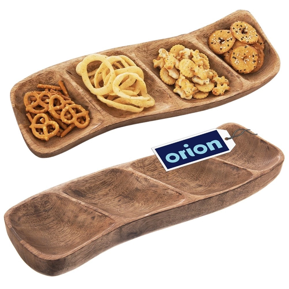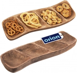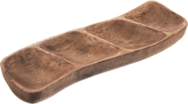 Elegáns fa szervírozótál 4 rekesszel, tartós mangófából. Kézzel készített, természetes mintázattal és sokoldalú felhasználással magvakhoz, olívához, aszalt gyümölcshöz, mártásokhoz és dippekhez. Stílusos tálalás otthon és éttermekben.