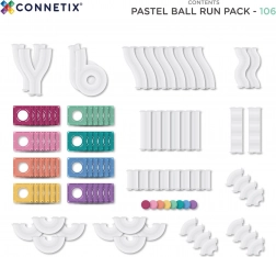 - 106 darab pasztell színekben – csövek, kanyarok, Y és S idomok, lépcsők, tölcsérek, golyók és lyukas lapok.