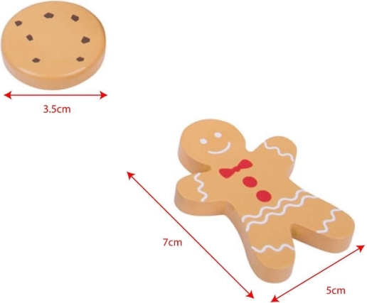 Bemutatjuk a fa dobozt játék sütikkel, amely kedvelt sütik válogatását tartalmazza, beleértve mézeskalácsokat és más finomságokat. Ez a készlet lehetőséget ad a kisgyermekeknek, hogy kreativitásukat fejlesszék a sütés által inspirált játék révén.