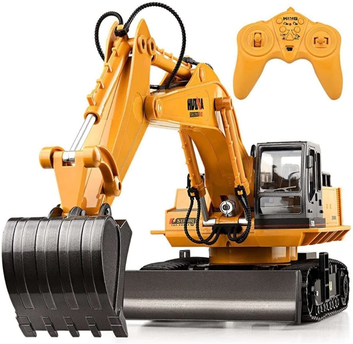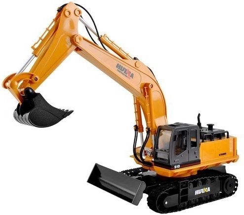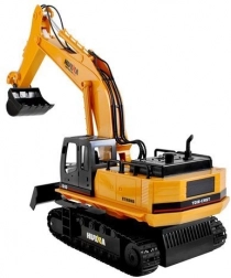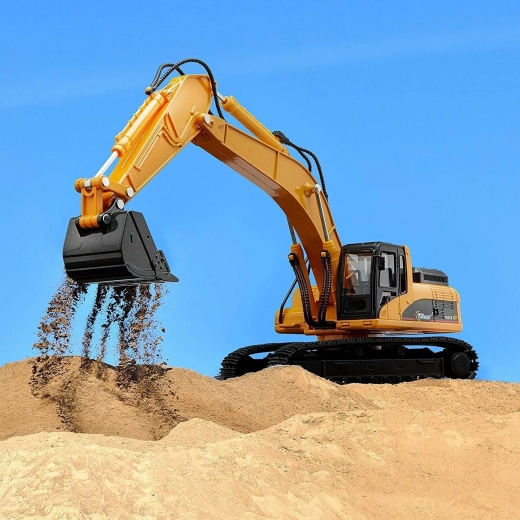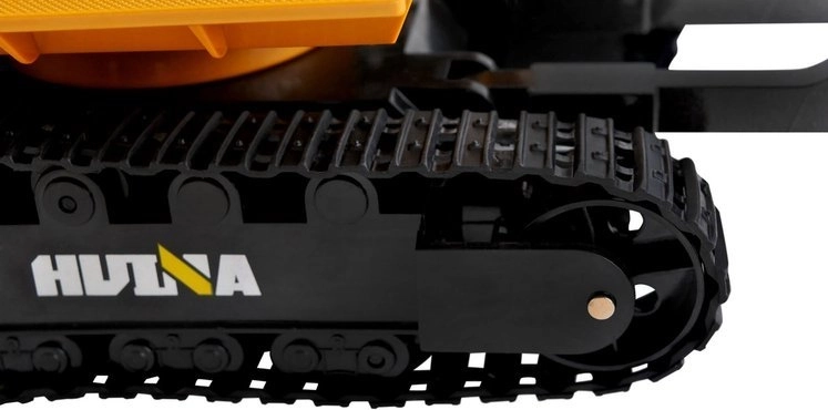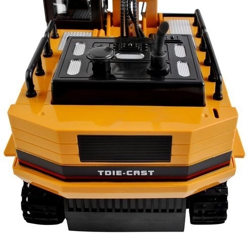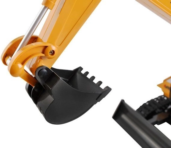 A távirányítós kotrógép masszív építőjárművekre jellemző konstrukcióval rendelkezik, valamint klasszikus színvilágot kínál - a sárga karosszéria számos fekete színű kontrasztos részlettel kombinálva van.
