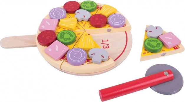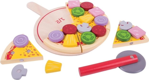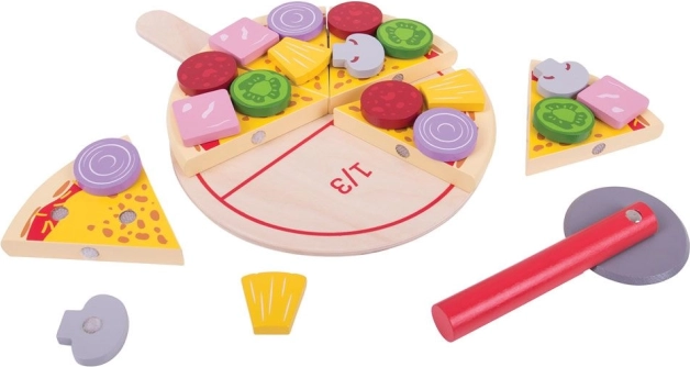 A fa vágós pizza ideális játék a kreatív szerepjátékhoz. A gyerekek „süthetnek”, szeletelhetnek és tálalhatnak, gombával, hagymával, paprikával vagy szalámival díszíthetik a pizzát, miközben kéz-szem koordinációjukat gyakorolják. A törteket jelölő alátét játékosan segít megérteni az olyan fogalmakat, mint az 1/2, 1/3 vagy 1/6.