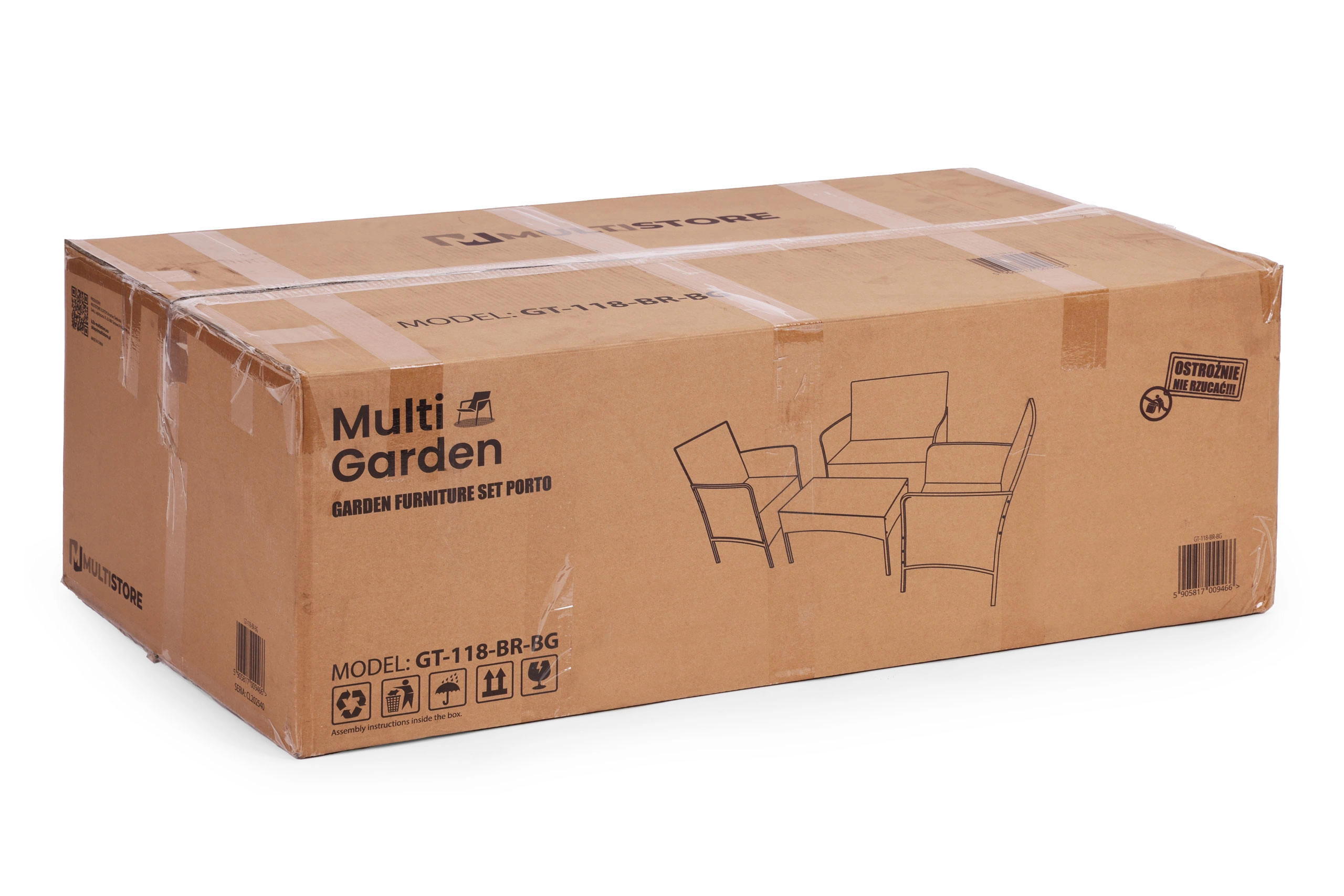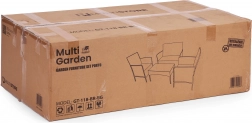 Elegáns, 4 személyes kerti szett a MULTIGARDEN márkától, amely stílust és kényelmet visz a teraszra, erkélyre vagy pergolába. Tartalma: 2 fotel, egy pad és egy dohányzóasztal edzett üveglappal. A tartós, rattan hatású műanyag szerkezet jól bírja az időjárást és könnyen tisztán tartható, míg a 160 g/m² poliészter párnák kényelmes ülést biztosítanak. Teherbírás: fotel 150 kg-ig, pad 250 kg-ig.