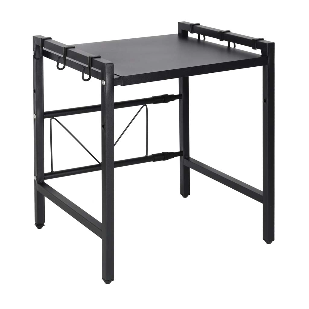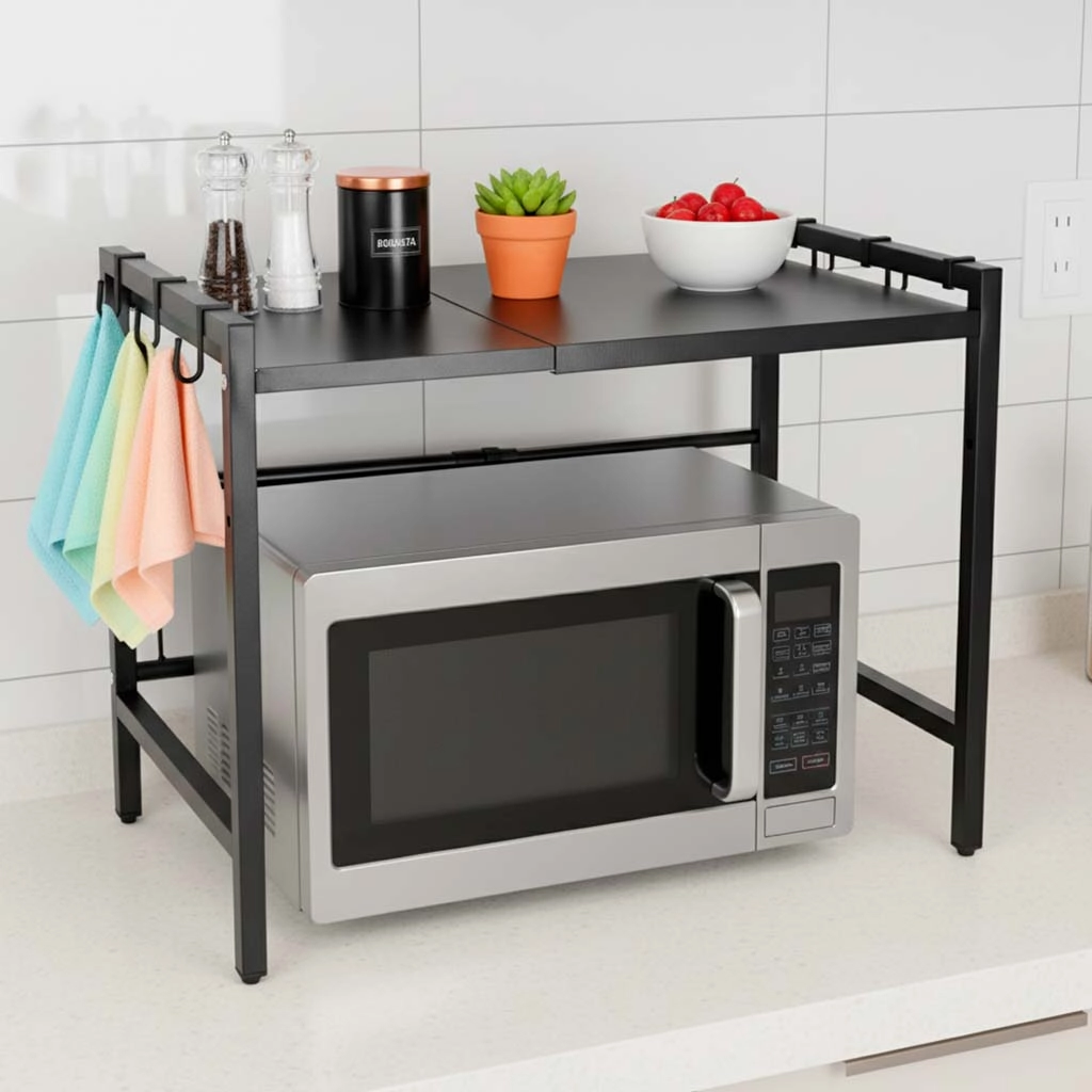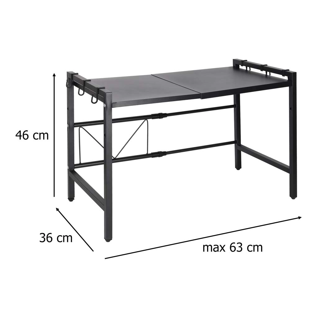 Praktikus és stabil, tartós acélból készült konyhai polc a mikrohullámú sütő fölé, amely több helyet biztosít a munkalapon. Bővíthető, állítható polcmagassággal rendelkezik, és a csomagban 6 kampó található a kiegészítőknek. A porszórt felület ellenáll a nedvességnek és a karcolásoknak, a polc pedig legfeljebb 30 kg terhet bír el behúzott szélességnél.