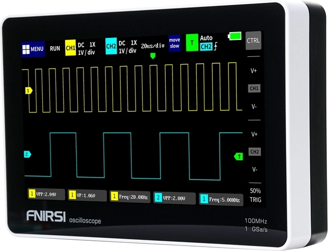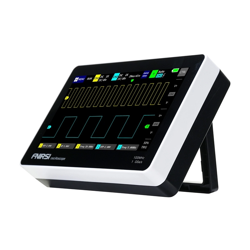 Az FNIRSI 1013D praktikus hordozható oszcilloszkóp analóg és digitális jelek precíz elemzéséhez. A 7 hüvelykes kapacitív TFT kijelző (800 × 480) tiszta jelalak-megjelenítést, gyors nagyítást és intuitív paraméterállítást nyújt. A két független csatorna 1 MΩ bemeneti impedanciával lehetővé teszi a jelek egyidejű összehasonlítását, beleértve a Lissajous-ábrák elemzését XY módban.