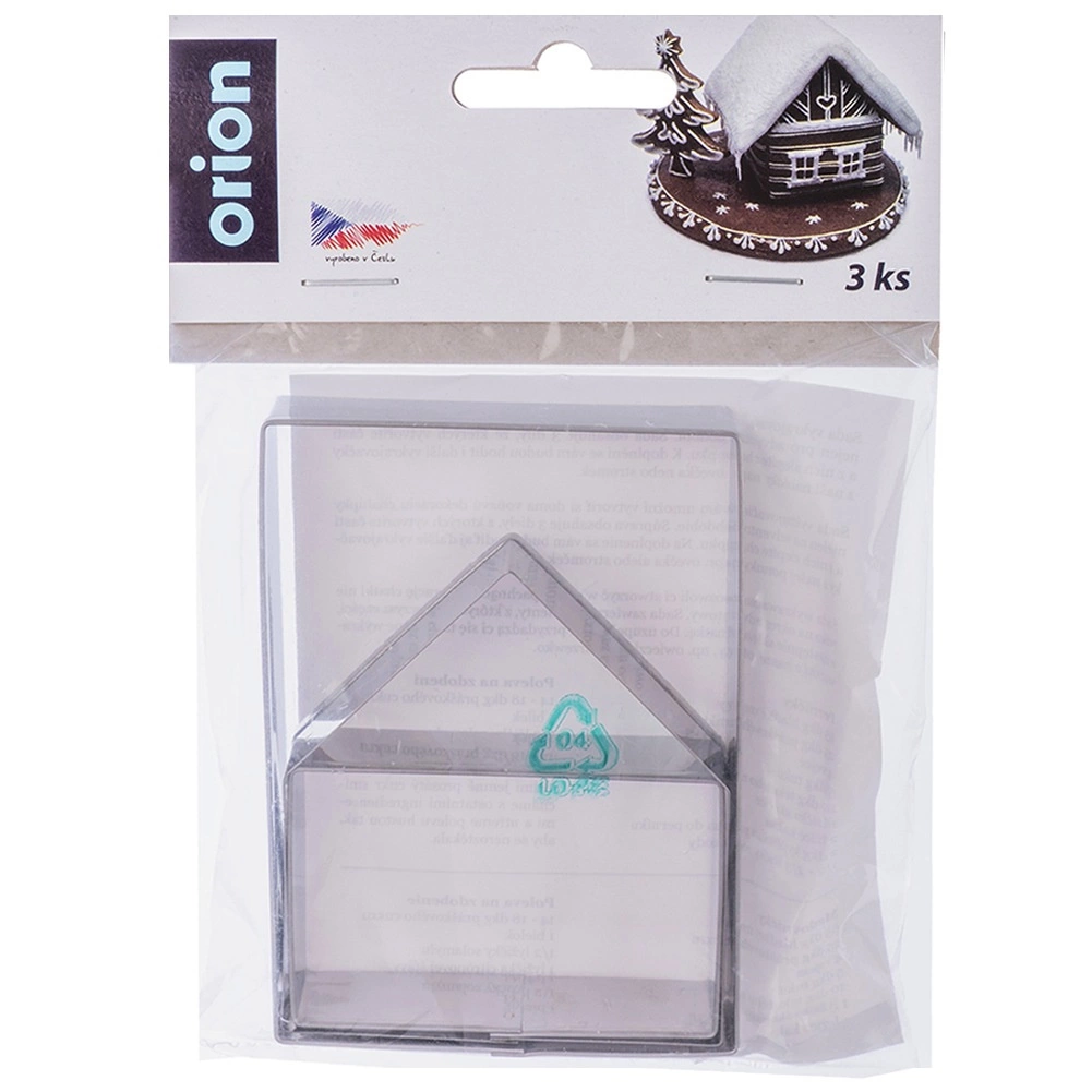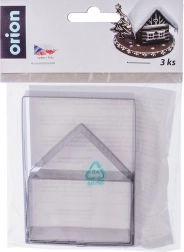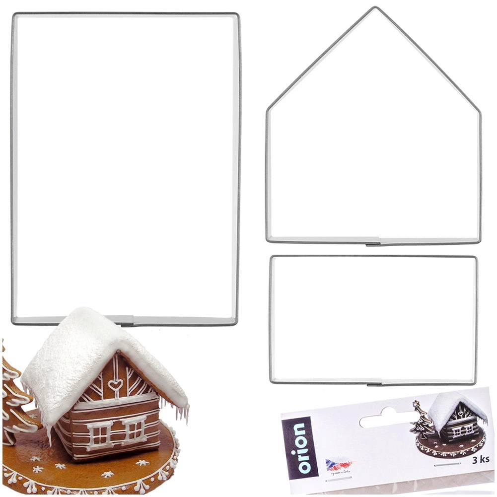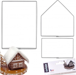 Három forma (ház, nagy és kicsi téglalap) az alkatrészek egyszerű kiszúrásához és egy mutatós mézeskalács házikó összeállításához.