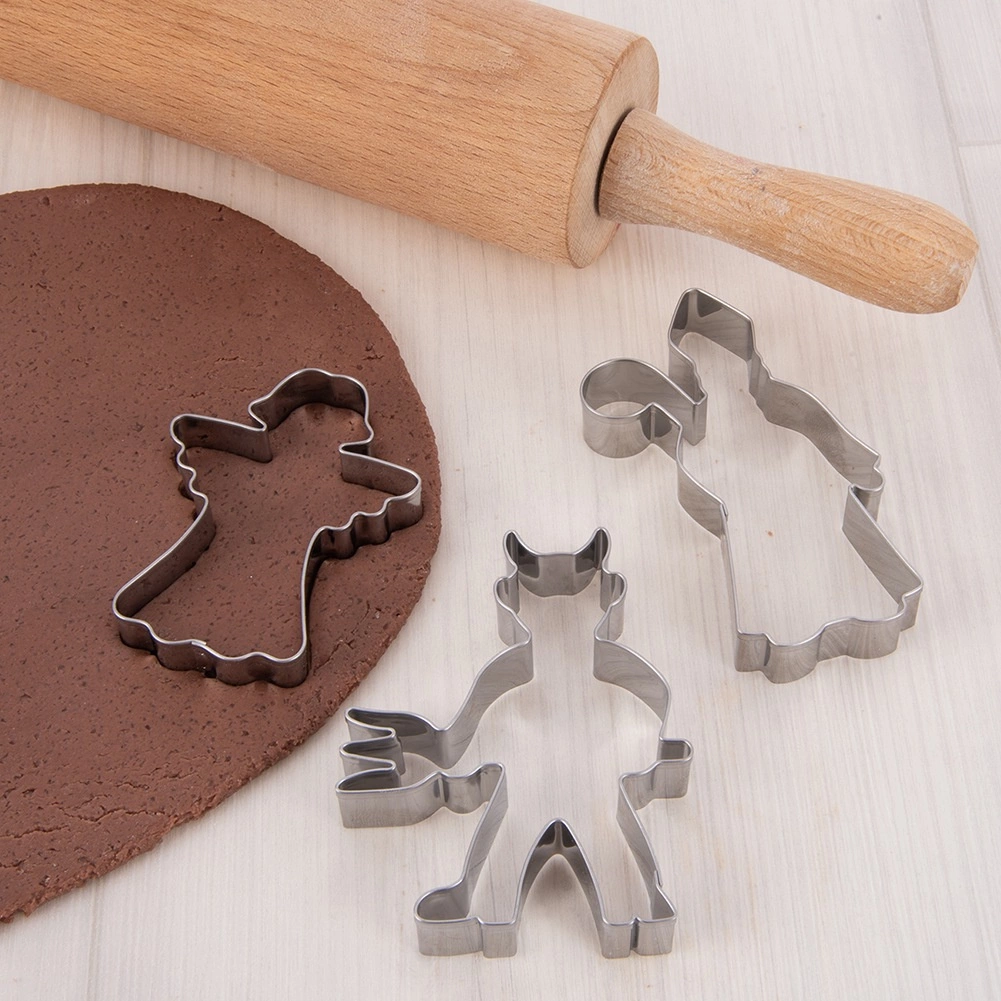 Stílusos, 3 darabos kiszúrókészlet, amely igazi ünnepi hangulatot varázsol a konyhába. A masszív, rozsdamentes acél kivitelnek köszönhetően könnyedén készíthet pontos körvonalakat és sima széleket mézeskalácsokhoz és kekszekhez. A kiszúrók kiválóak fondanthoz, marcipánhoz és keksztésztához is.