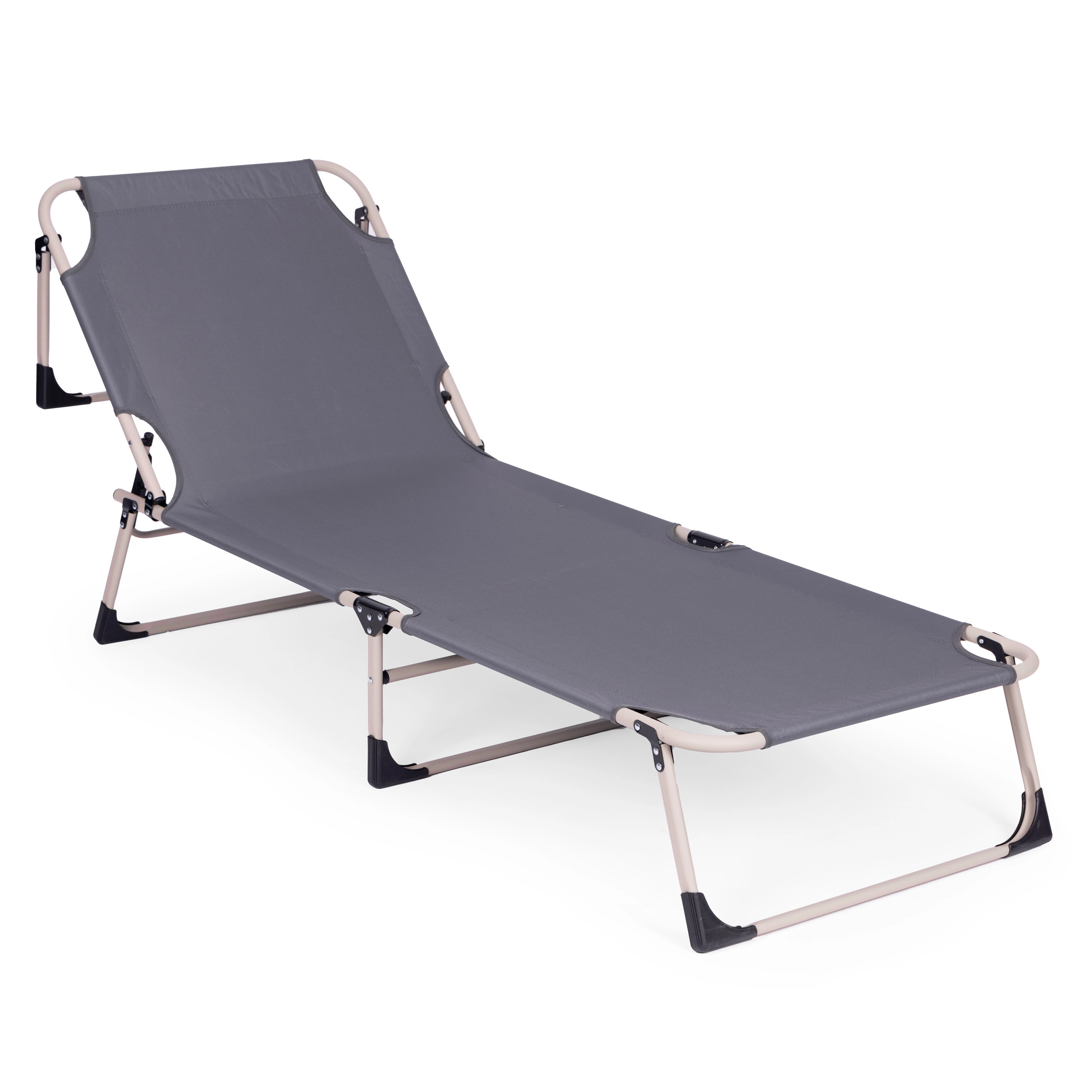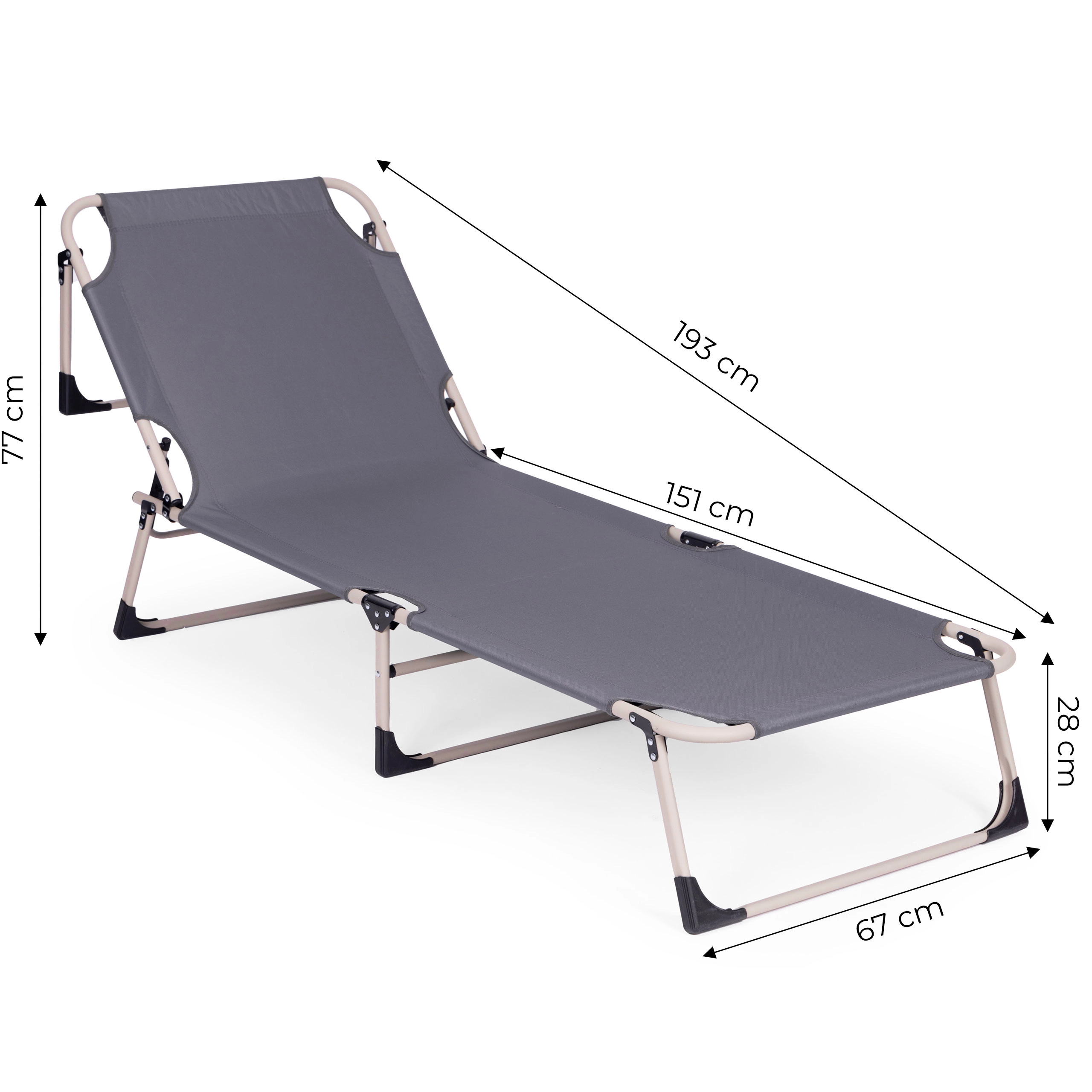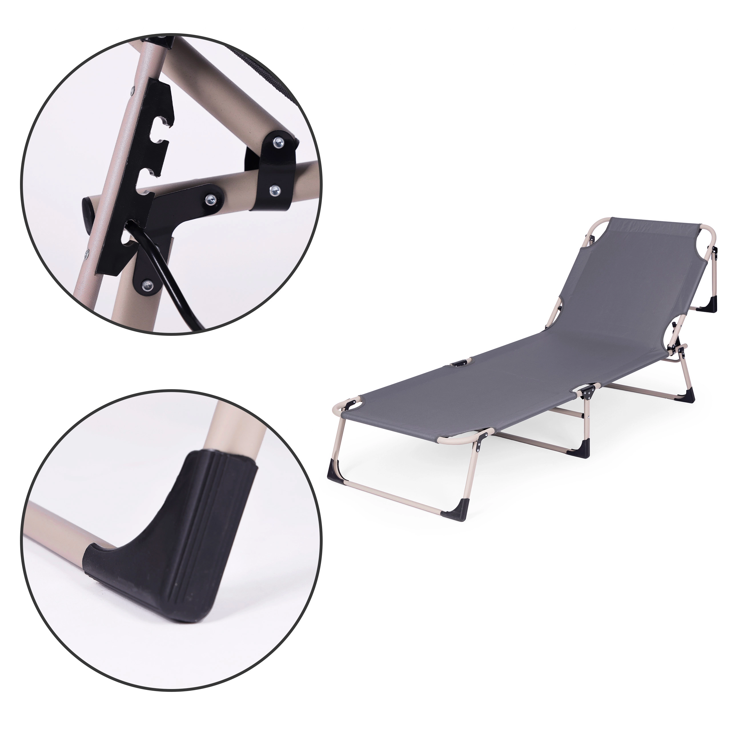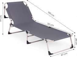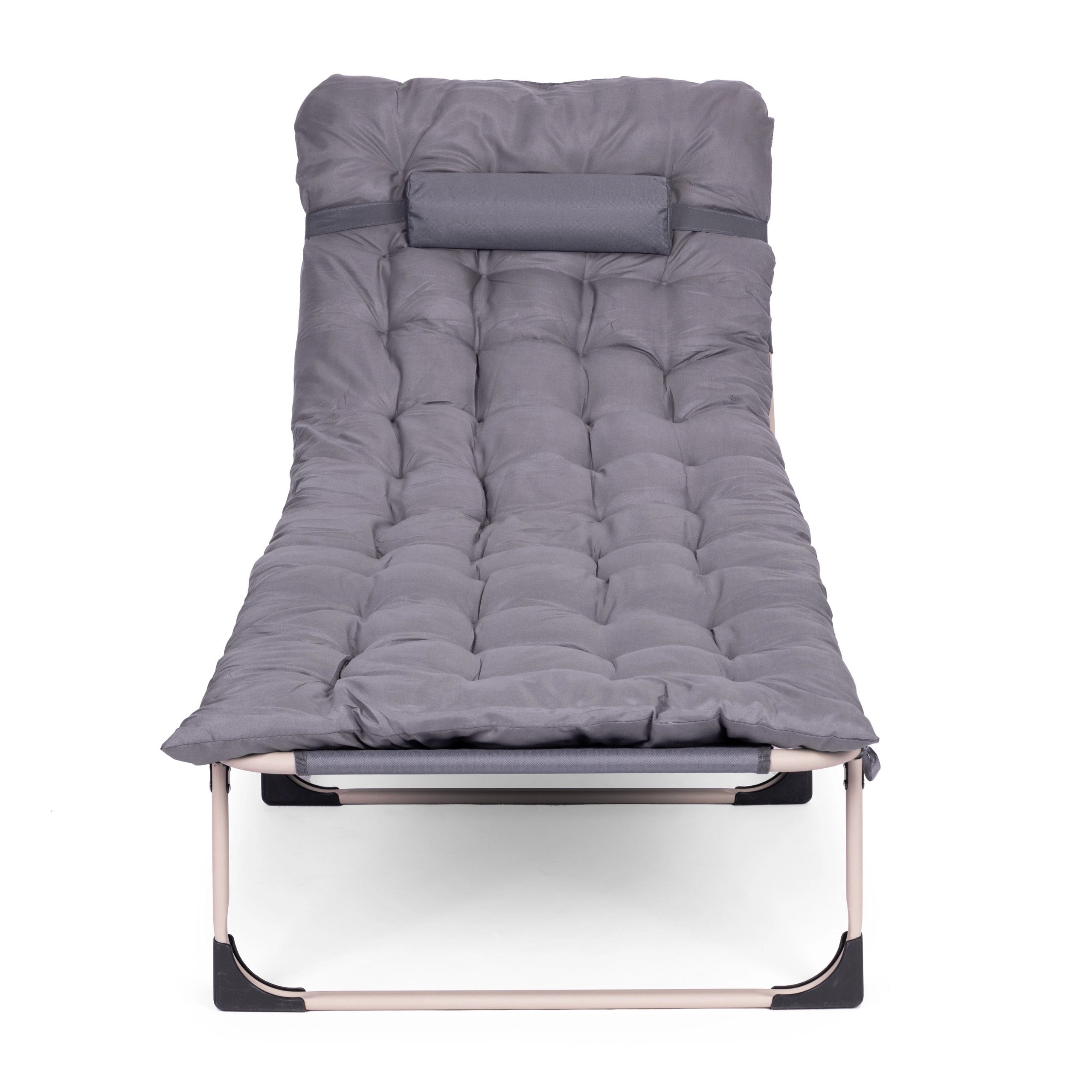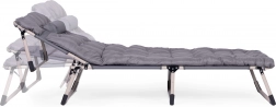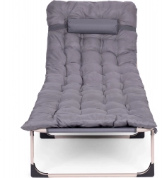Élvezze a pihenést a kertben, horgászat közben vagy a teraszon a univerzális szürke színű összecsukható nyugággyal. Kínál puha matracot párnával, 4 fokozatú háttámla-állítást egészen fekvő helyzetig, stabil fém szerkezetet csúszásgátló talpakon és könnyű összecsukhatóságot szállításhoz és tároláshoz. Maximális teherbírás 120 kg.