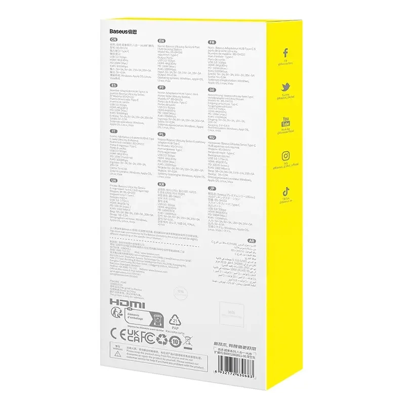 A kompakt BASEUS UltraJoy 6 az 1-ben elosztó kibővíti a laptopot vagy táblagépet 4K@30 Hz HDMI-vel, 3× USB 3.0-val (akár 5 Gb/s), RJ45 1 000 Mb/s hálózattal és USB‑C PD 100 W gyorstöltéssel. Az elegáns alumínium ház, a tartós szövetborítású kábel és az univerzális kompatibilitás stabil csatlakozást és maximális produktivitást biztosít otthon, irodában és útközben is.