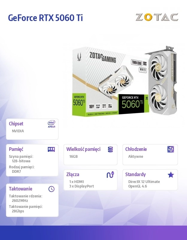 A kompakt ZOTAC GAMING GeForce RTX 5060 Ti Twin Edge OC 16 GB White videokártya a NVIDIA Blackwell architektúrára épül, 16 GB GDDR7 memóriát, DLSS 4 támogatást és hatékony kétventilátoros hűtést kínál. A gyári tuningnak köszönhetően sima játékélményt és magas teljesítményt nyújt a modern címekben, miközben megőrzi kiváló hatékonyságát és alacsony zajszintjét.