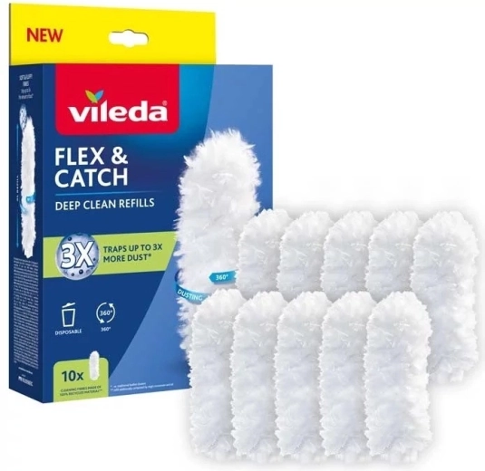 A VILEDA Flex & Catch portörlőhöz készült praktikus cserefejekkel a por gyors és alapos eltávolítása még nehezen hozzáférhető helyekről is egyszerű. A 360°-os szálaknak köszönhetően akár 3× több port is felfognak, mint a hagyományos portörlők, 20%-kal nagyobb tisztítófelülettel rendelkeznek, és 100% újrahasznosított szálakból készülnek a fenntarthatóbb takarításért.