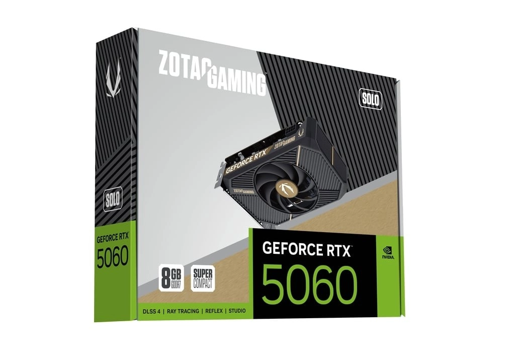 Az ultrakompakt ZOTAC GAMING GeForce RTX 5060 SOLO videokártya a legújabb NVIDIA Blackwell architektúrát, a DLSS 4-et és a 8 GB GDDR7 memóriát hozza el a kis házakba. Az egyetlen ventilátoros hűtésnek és a két bővítőhelyes kivitelnek köszönhetően kiváló méret–teljesítmény arányt kínál játékhoz és munkához egyaránt. Nem hiányzik a 3× DisplayPort és 1× HDMI sem, így több monitor is könnyen csatlakoztatható.