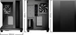 Kompakt alapterülete ellenére a házba akár 360 mm-es radiátor, ATX alaplap és akár 400 mm hosszú videokártya is befér. Az okos meghajtótartó egyszerre biztosít helyet 2× HDD és 2× SSD számára anélkül, hogy korlátozná a tálca mögötti kábelvezetést. A két lehetséges tápegység-pozíció lehetővé teszi a hátlapi csatlakozós lapok (Asus BTF, MSI Project Zero, Gigabyte Project Stealth) használatát úgy, hogy közben nem veszít szerelőhelyet a tárhelyekhez.