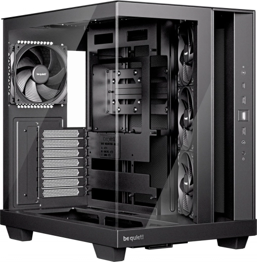 A Light Base 500 Black átgondolt légáramlást kínál a szögben állítható, kihúzható ventilátorkerettel, amely a hűtőlevegőt közvetlenül a GPU-ra irányítja. A ventilátorok süllyesztett oldalsó tálcába is szerelhetők az alsó beszívás ideális illesztéséhez, míg a kábelcsatorna a belsőt tisztán és átláthatóan tartja. A négy halk Pure Wings 3 120 mm PWM ventilátor magas légszállításra és alacsony zajra optimalizált – az oldalsó egységek fordított lapátokkal ráadásul remekül mutatnak a perforáción keresztül.