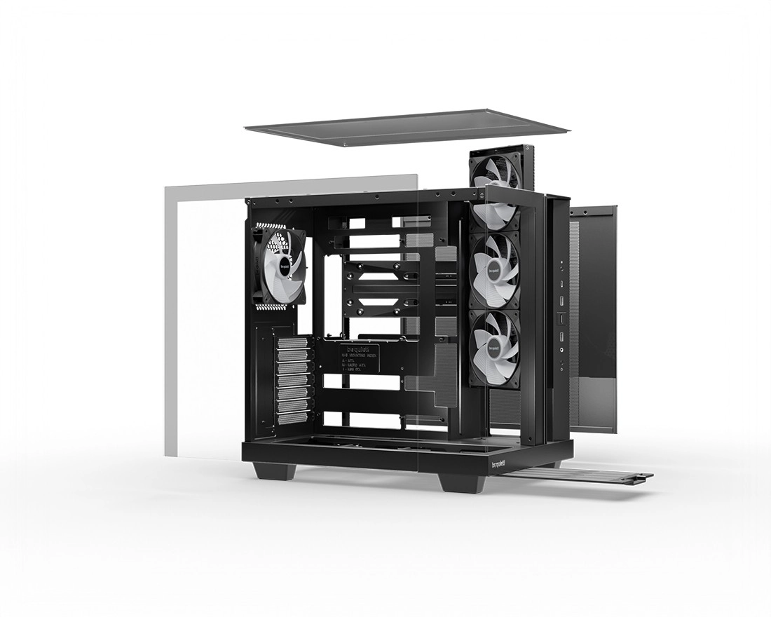 A Light Base 500 LX Black elegáns megjelenést és praktikus megoldásokat hoz a rajongók és a játékosok számára. A ferde, oldalról kihúzható ventilátorkeret közvetlenül a grafikus kártyára irányítja a légáramot, miközben hatékony oldalsó beáramlást hoz létre. A ventilátorok az alsó, süllyesztett fészekbe szerelhetők, hogy a ház aljával egy síkban legyenek és maximalizálják a légáramlást. A kábelezés könnyen elrejthető az átgondolt kábelcsatornáknak köszönhetően a tiszta, kábelmentes megjelenésért.