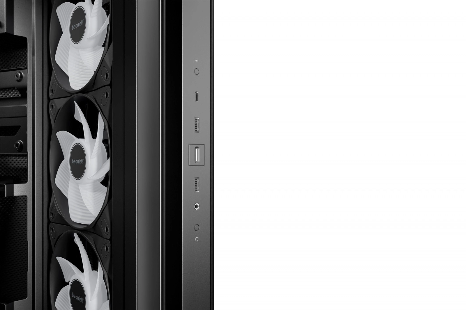 A négy Light Wings LX 120 mm PWM (hátsó + oldalsó, megfordított lapátokkal) nagy légszállítást és lenyűgöző ARGB megvilágítást biztosít 16 LED-del a rotor agyában. Az I/O panelbe integrált ARGB gomb előre beállított effekteket és színeket kínál, a mellékelt 6 csatornás ARGB/PWM hub pedig 4 szabad portot hagy további eszközöknek.