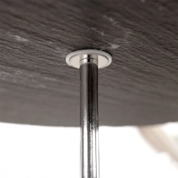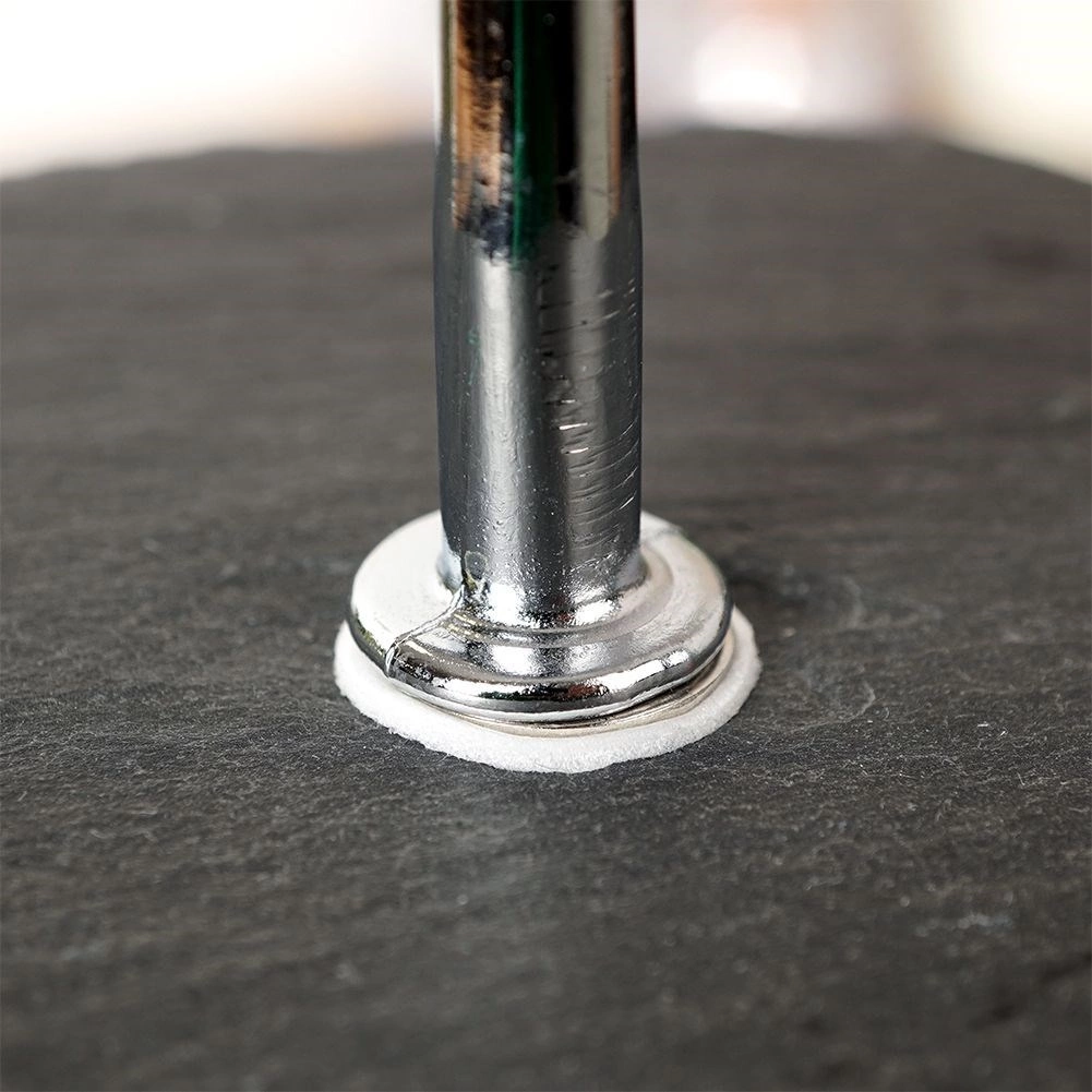 A robusztus kőtányérok és a krómozott hatású, erős fémrúd stabilitást biztosítanak, míg a négy védő alátét óvja az asztallapot a karcolásoktól. Az összecsukható kialakítás gyors szét- és összeszerelést, valamint kompakt tárolást tesz lehetővé, amikor éppen nem tálal.