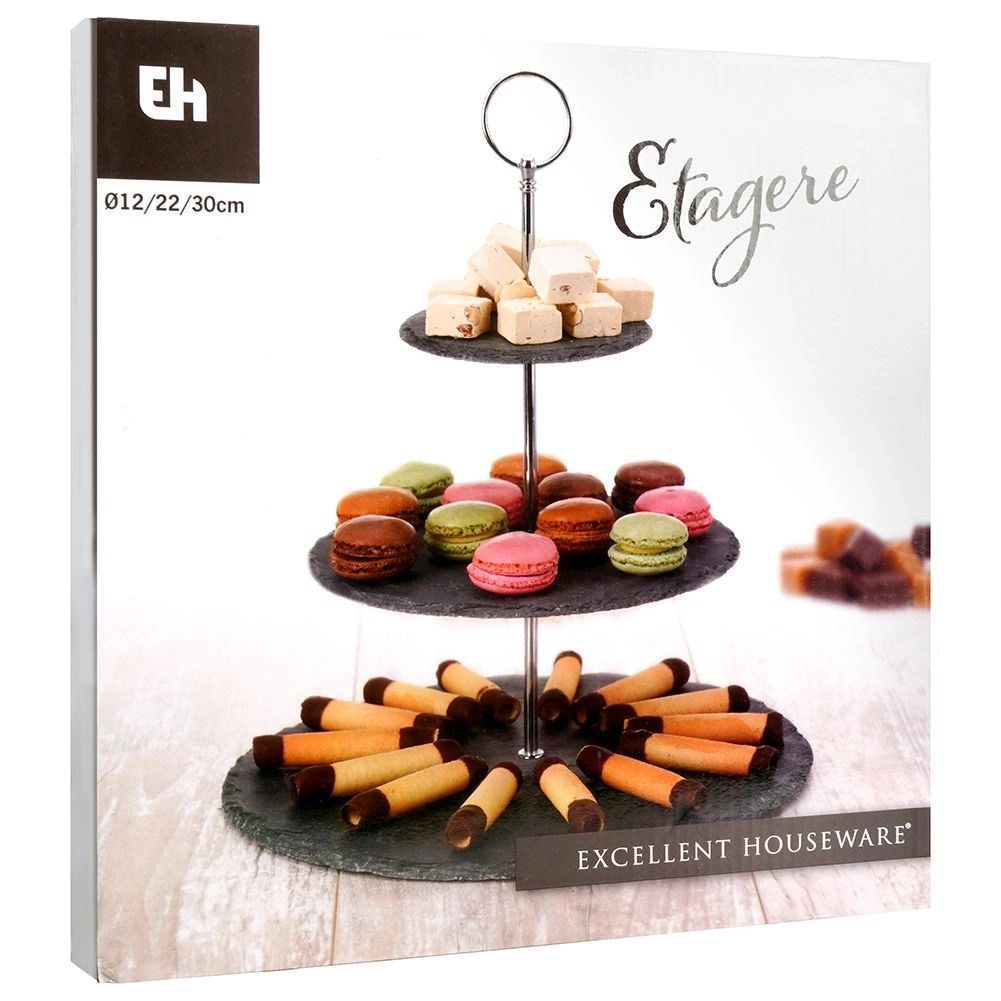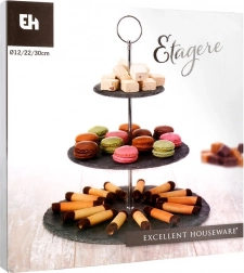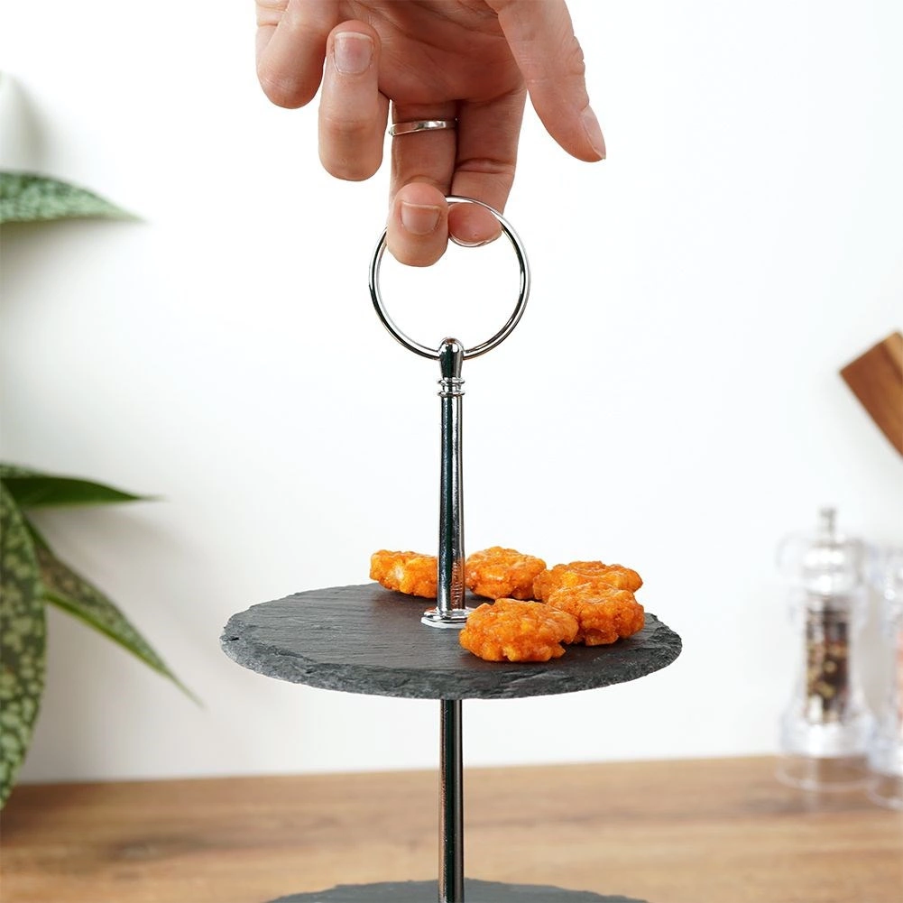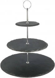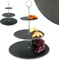Az elegáns, háromszintes fekete palatál állvány modern, természetes megjelenést kölcsönöz az asztalnak. Ideális cupcake-ek, kekszek, makaronok, sajtok, gyümölcsök és sós falatok tálalására. A praktikus felső fülnek köszönhetően könnyedén áthelyezhető a konyhából az asztalra.