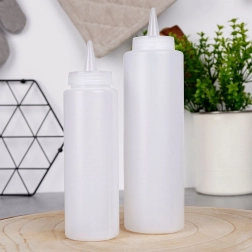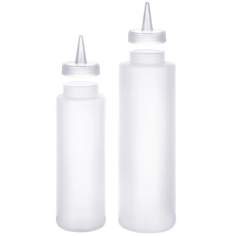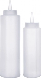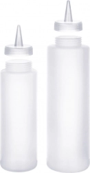 Praktikus, két darabos adagolópalack-készlet 250 ml és 500 ml űrtartalommal, szószok, olajok pontos adagolásához vagy desszertek díszítéséhez. Rugalmas fal a könnyű nyomhatóságért, csavaros kupak keskeny fúvókával a precíz adagoláshoz, valamint strapabíró kivitel tejszerűen átlátszó műanyagból. Mosogatógépben mosható, ideális otthoni és professzionális konyhába.