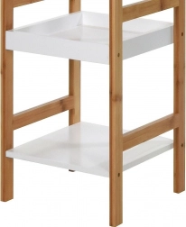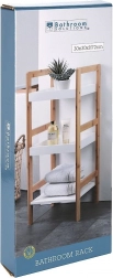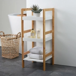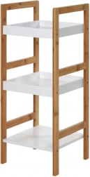 Stílusos, háromszintes állvány bambuszfából és MDF-ből, természetes megjelenéssel és funkcionális kialakítással. Illik a fürdőszobába, de kiválóan használható a konyhában, kamrában, erkélyen vagy teraszon is. Kompakt 30 × 30 × 72 cm-es méretének köszönhetően kisebb helyekre is befér, és elegendő helyet biztosít a mindennapi szükségleteknek.