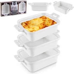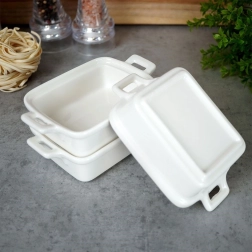 Ezek a kompakt, téglalap alakú, integrált füles sütőtálkák tökéletesek crème brûlée-hez, szufléhez, kisebb rakott ételekhez, gratinhoz vagy mini lasagnéhoz. A minőségi porcelán egyenletesen vezeti a hőt és tovább melegen tartja az ételeket, így közvetlenül a sütőből az asztalra tálalhatók.