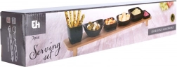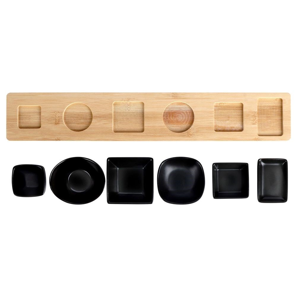 Elegáns, 7 részes szervírozókészlet fekete kerámia tálkákkal egy megmagasított bambusz tálcán, 50 cm hosszban. Ideális előételekhez, mártogatósokhoz, szószokhoz és snackekhez. A tálkák különböző formájúak és űrtartalmúak, a tálca kijelölt pozíciói pedig stabilitást adnak hordozás közben. A minimalizmus és a modern dizájn kombinációja stílusos terítéshez otthon és a vendéglátásban.
