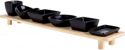 Ez a dizájn szett a praktikumot és az esztétikát ötvözi a mindennapi szervírozás során. A hat fekete színű kerámia tálkát masszív, lábakon álló bambusz talp egészíti ki, amely mindent áttekinthetően rendszerez és elegánsan az asztal fölé emel. A precízen formázott mélyedéseknek köszönhetően a tálkák helyükön maradnak hordozás közben is.