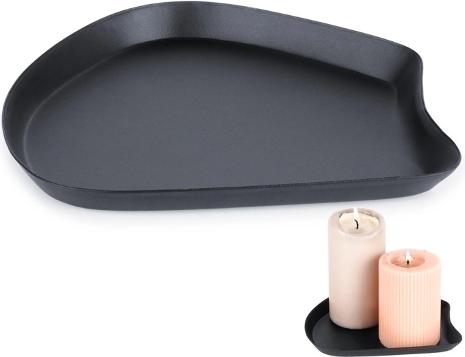 Elegáns tálca minimalista dizájnnal a gyertyák, kompozíciók és apróságok biztonságos kihelyezéséhez. Fém kivitel matt fekete felülettel, szabálytalan formával és megemelt peremmel, amely védi a bútort a viasztól és a hőtől. Tartós, stabil és stílusos, modern enteriőrökbe illik.