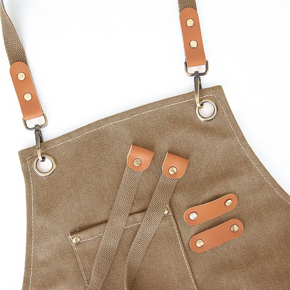 Erős vászon megerősített varrással, fém ringlik és műbőr részletek a hosszú élettartamért a konyhában és a műhelyben is.