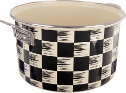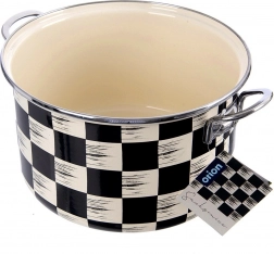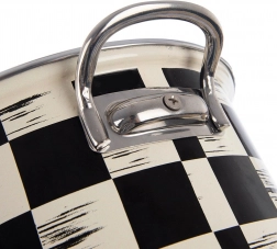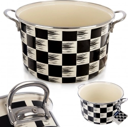 Stílusos, 6,5 l űrtartalmú, 26 cm átmérőjű zománcozott lábas fekete-bézs sakktábla dizájnnal. Minőségi zománcozott acélból készült rozsdamentes peremmel és fém fülekkel a biztonságos fogásért. Alkalmas minden típusú tűzhelyhez, beleértve az indukciót, sütőbe és mosogatógépbe is – ideális levesek, mártások és párolt ételek készítéséhez.