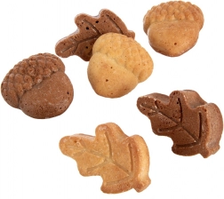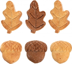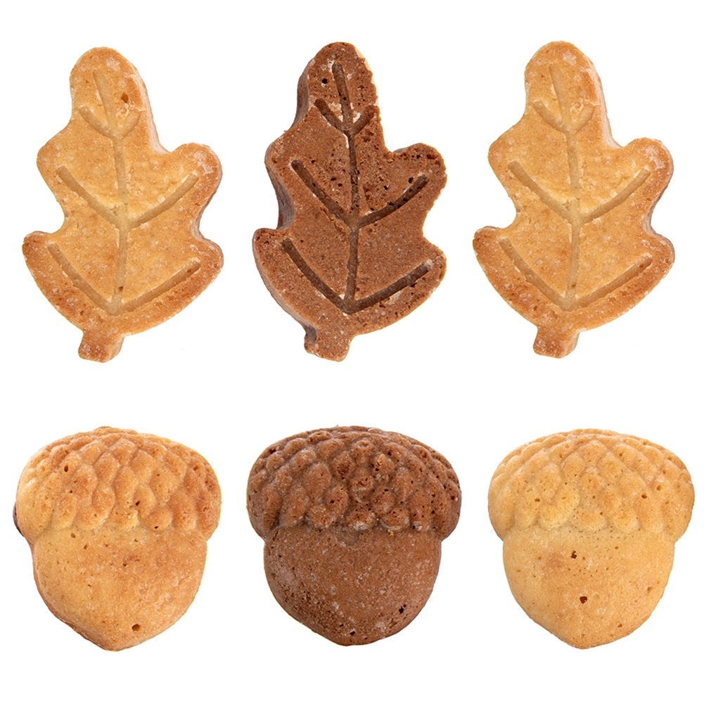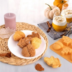 Praktikus szilikon sütőforma őszi levél- és makk-motívumokkal, 6 darabhoz. A rugalmas anyagnak és az tapadásmentes felületnek köszönhetően könnyedén kifordíthatod a tökéletesen formázott kekszeket, mini kuglófokat vagy pralinékat. A forma −40 °C-tól +220 °C-ig hőálló, sütőben, fagyasztóban, mikrohullámú sütőben és mosogatógépben is használható, és egyenletes átsülést biztosít odaégés nélkül.