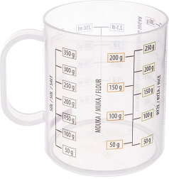 Praktikus konyhai mérőedény bögrének formában, 250 ml űrtartalommal a szilárd és folyékony alapanyagok pontos kiméréséhez. A jól olvasható skálanak köszönhetően l, ml és g jelöléssel könnyedén kimérheti a lisztet, cukrot, rizst, sót és a folyadékokat. A könnyű és tartós anyag élelmiszerbiztonságos, az ergonomikus fül kényelmes használatot biztosít, a mosogatógépben mosható kivitel pedig megkönnyíti a tisztítást.