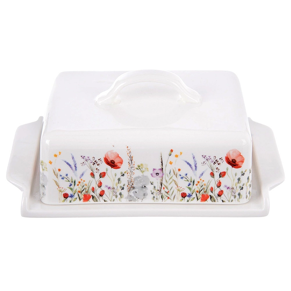 A finom pipacs- és mezei virág dekorral díszített porcelán vajtartót a vaj tárolására és tálalására tervezték. A praktikus fogantyúval ellátott fedél megóvja a vajat a hűtőszagoktól, és segít megőrizni frissességét és teljes ízét. Időtlen formája illik bármely konyhába, és harmonizál különféle terítékekkel.