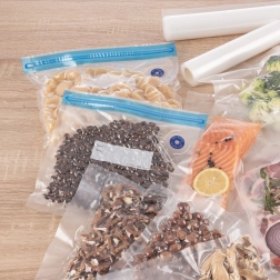 Megbízható, légmentes zárás dupla cipzárral és szeleppel a gyors levegőelszíváshoz. Az ételek tovább maradnak frissek és védettek.