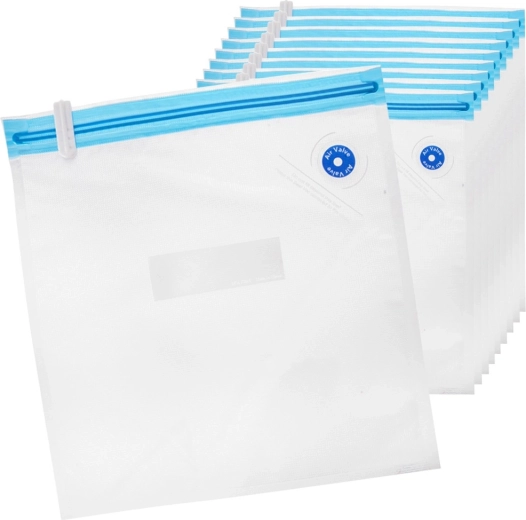 Praktikus vákuumtasak-készlet az élelmiszerek hosszabb frissen tartásához és helytakarékos tárolásához. Minden tasak mérete 26 × 28 cm, újrafelhasználható, BPA-mentes, és −20 °C-tól +110 °C-ig hőálló. A dupla cipzárnak és a levegőelszívó szelepnek köszönhetően légmentes zárást, akár 5× hosszabb frissességet és megbízható szagvédelemet érhet el.