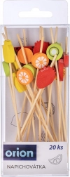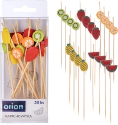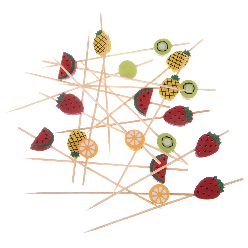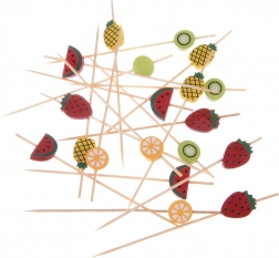 Minden pálcikát egyedi gyümölcs topper díszít, amely játékos megjelenést ad a kínálatnak, és kiemeli a kanapék, sajtok vagy gyümölcsök prezentációját.