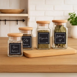 Őrizze meg a rendet a spájzban stílusosan. A fekete öntapadós címkék ideálisak házi befőttekhez, fűszerekhez, szemes és szóródó élelmiszerekhez, valamint ajándékcsomagoláshoz. A laminált felület ellenállóbb a szennyeződésekkel szemben, és minden címke kijelölt helyet kínál a névnek, összetevőknek vagy dátumnak.