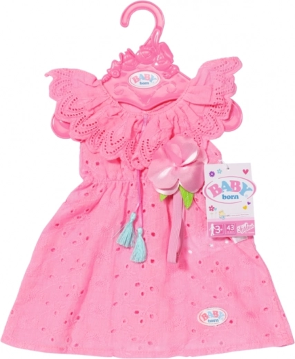 Az öltözék 43 cm-es BABY born babákhoz készült, és kiváló alap a szerepjátékokhoz, a finommotorika és a képzelet fejlesztéséhez. A csomagban rózsaszín vállfa is található a kényelmes szekrénybe helyezéshez.