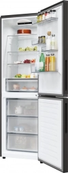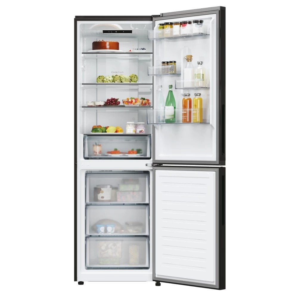 Ez a szabadonálló, alul fagyasztós hűtőszekrény az elegáns fekete dizájnt praktikus belső elrendezéssel ötvözi. A széles üvegpolcok, a magasságban állítható ajtórekeszek és a fényes LED világítás kiváló áttekintést nyújt az élelmiszerekről. A fagyasztó átlátszó fiókjai megkönnyítik a rendszerezést és a gyors tájékozódást.