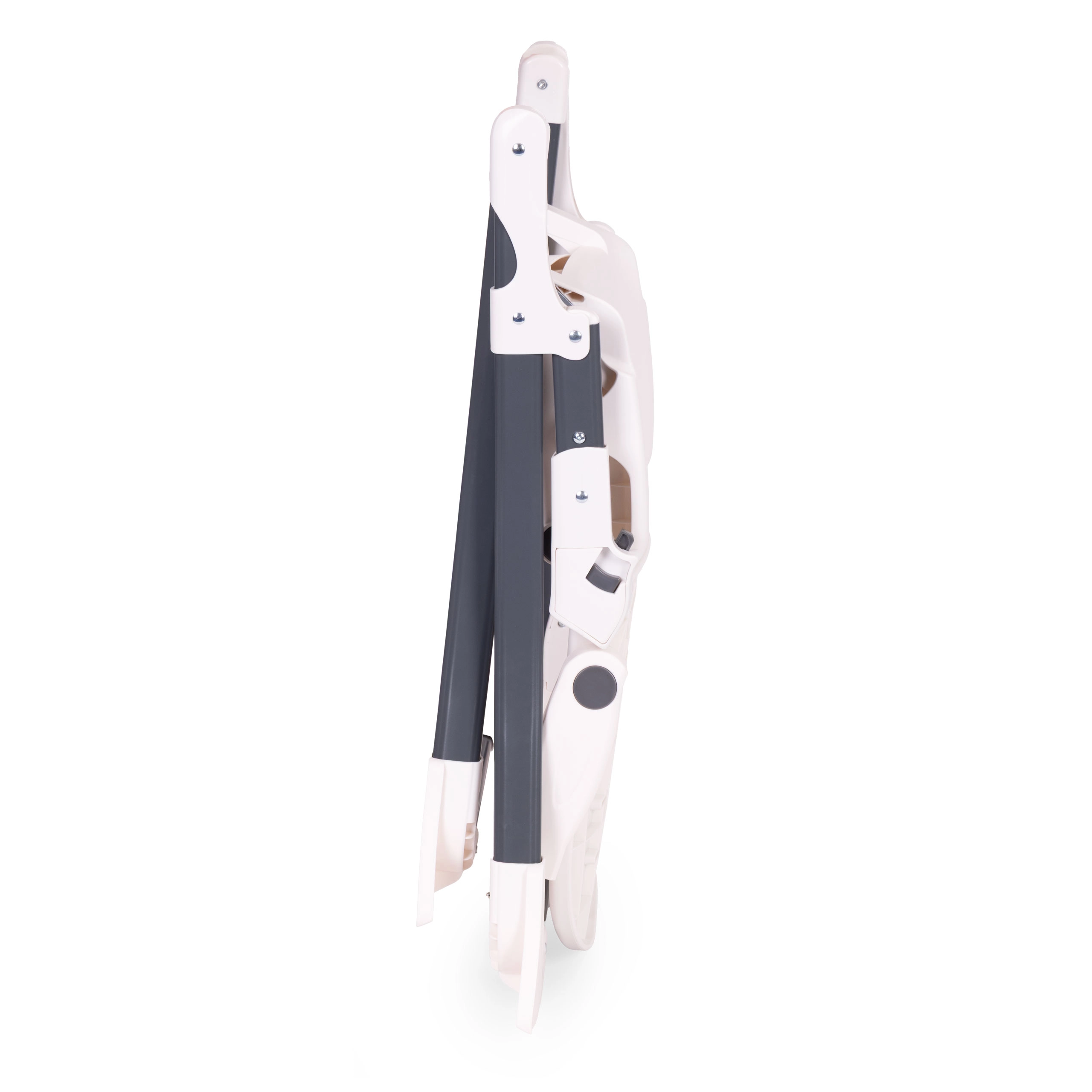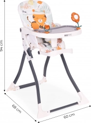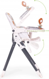 Praktikus és biztonságos etetőszék 6–36 hónapos gyermekeknek, erős acél vázzal, állítható tálcával és lábtartóval, valamint 3 pontos biztonsági övvel. A összecsukható rendszernek köszönhetően könnyen elrakható vagy utazáshoz vihető. Tartozék az eltávolítható huzat az egyszerű tisztításért, valamint a tálcán egy csörgő és forgó játék, továbbá a biztonsági terpesztő elem a lecsúszás ellen. Maximális teherbírás 15 kg.
