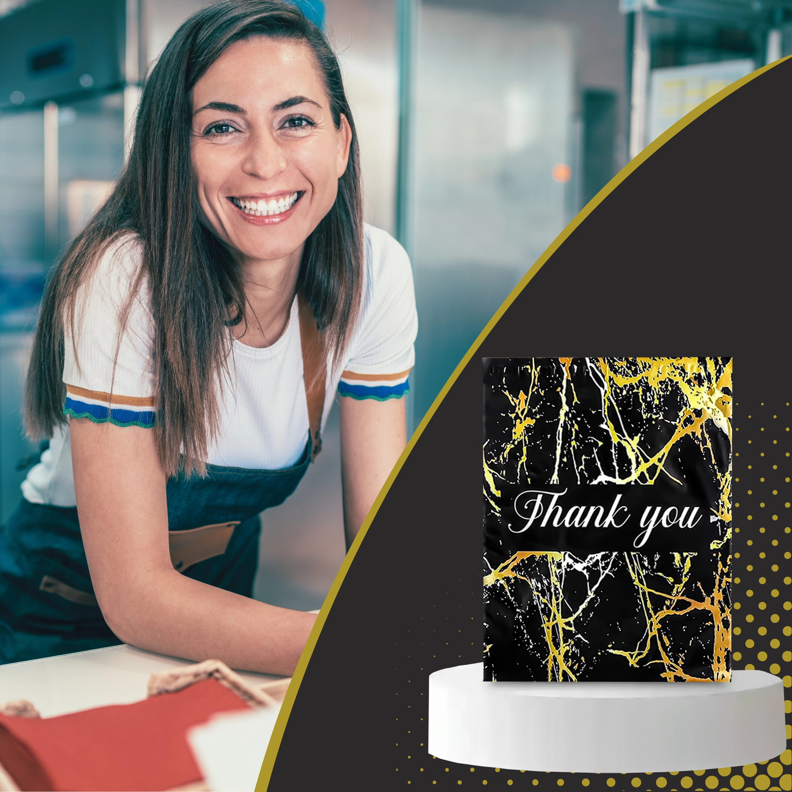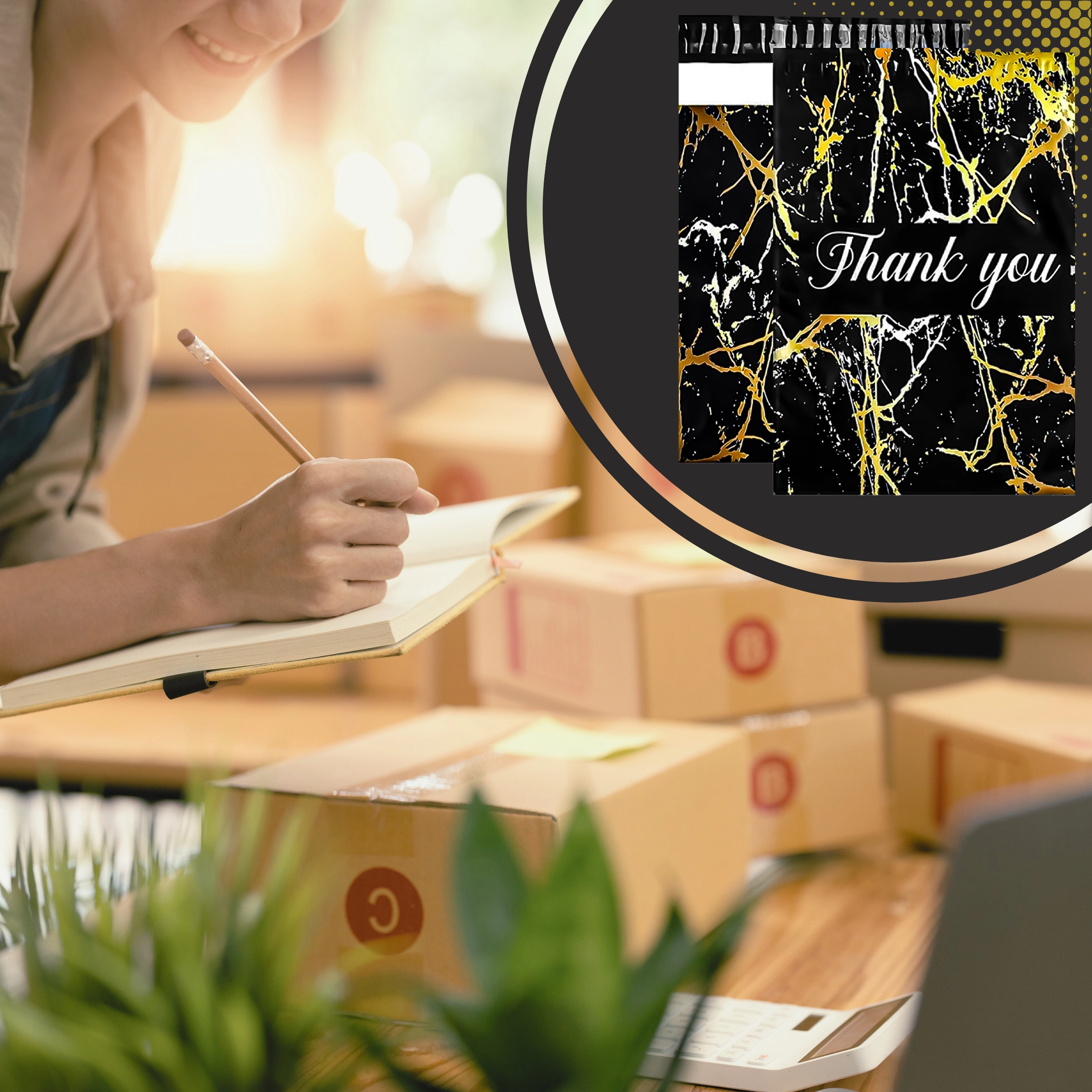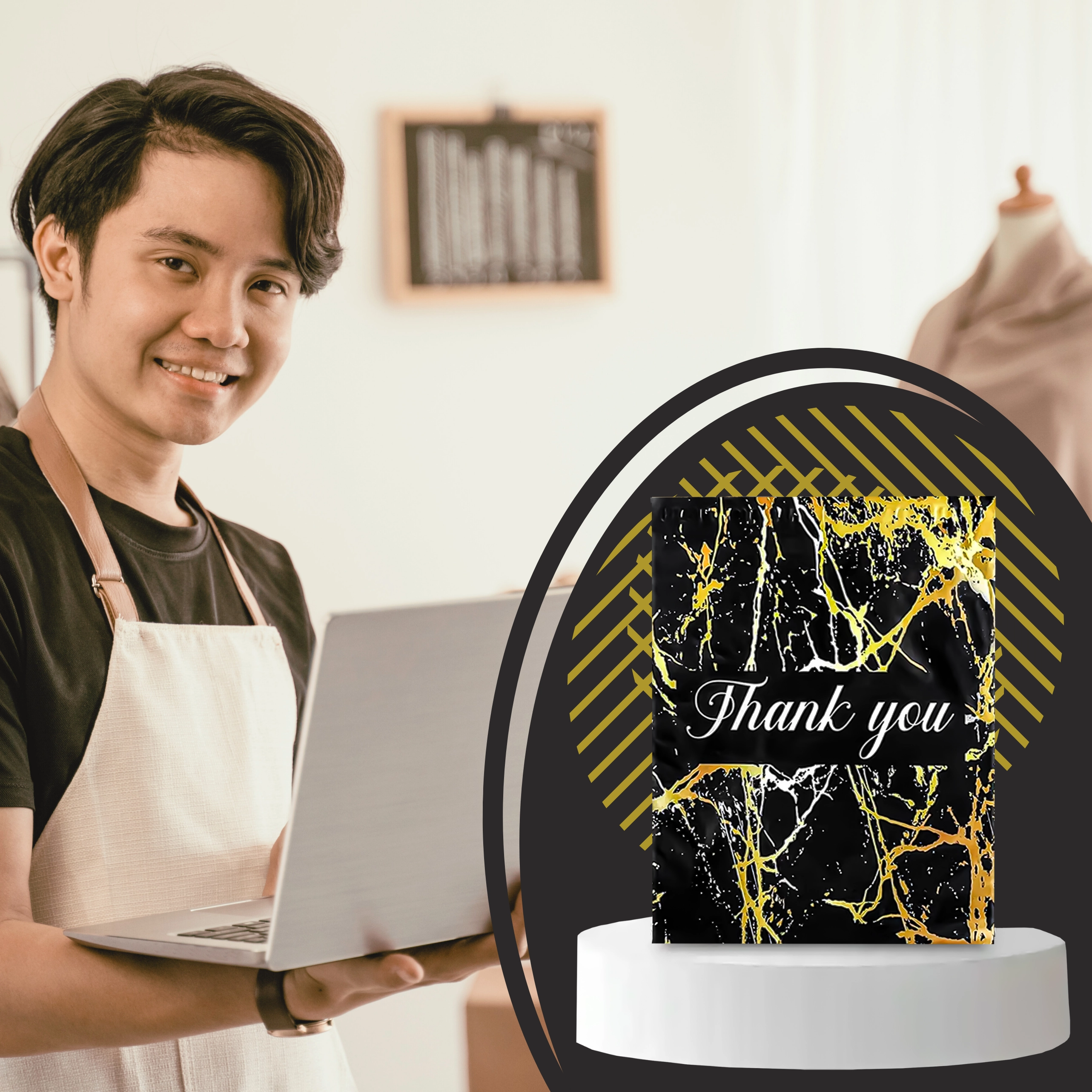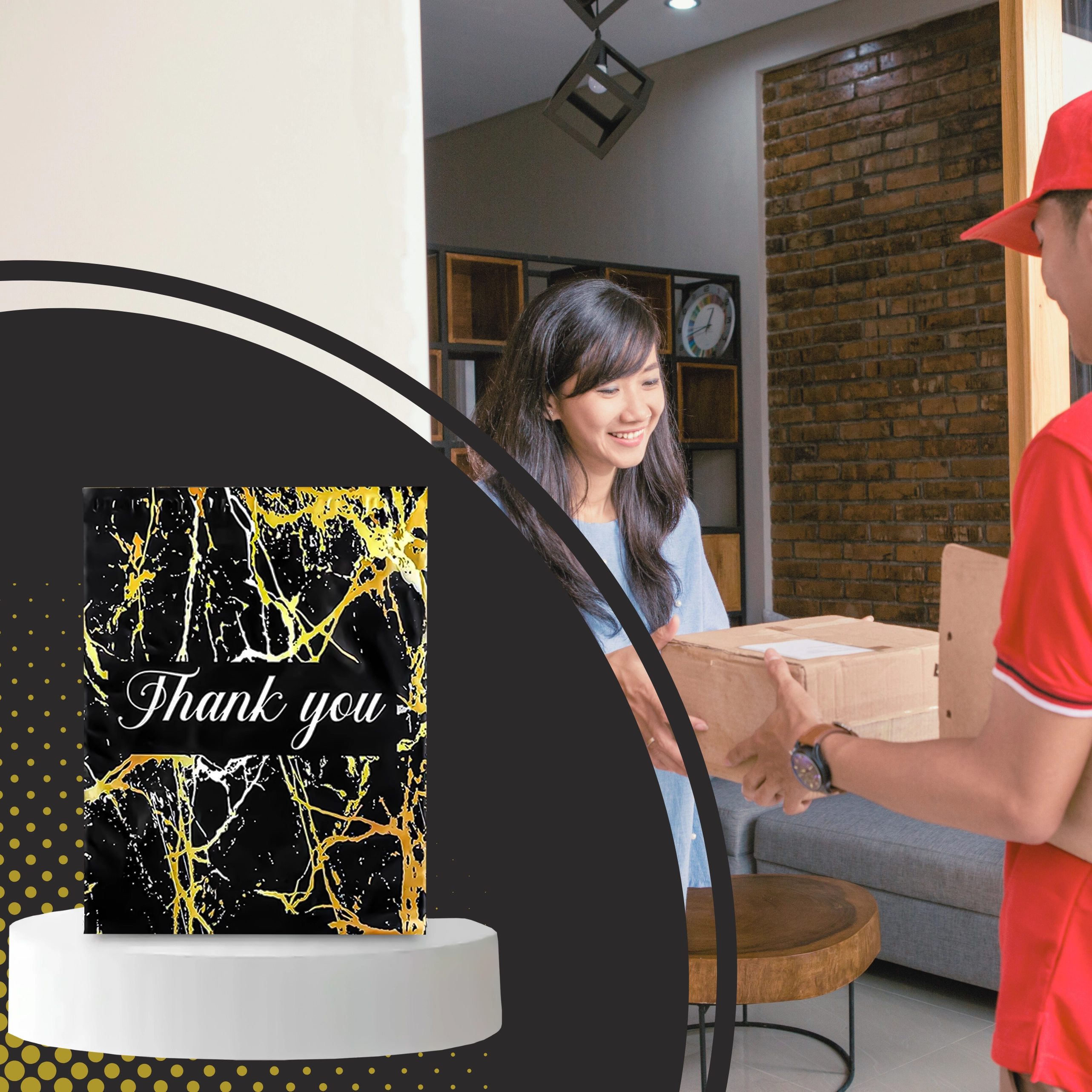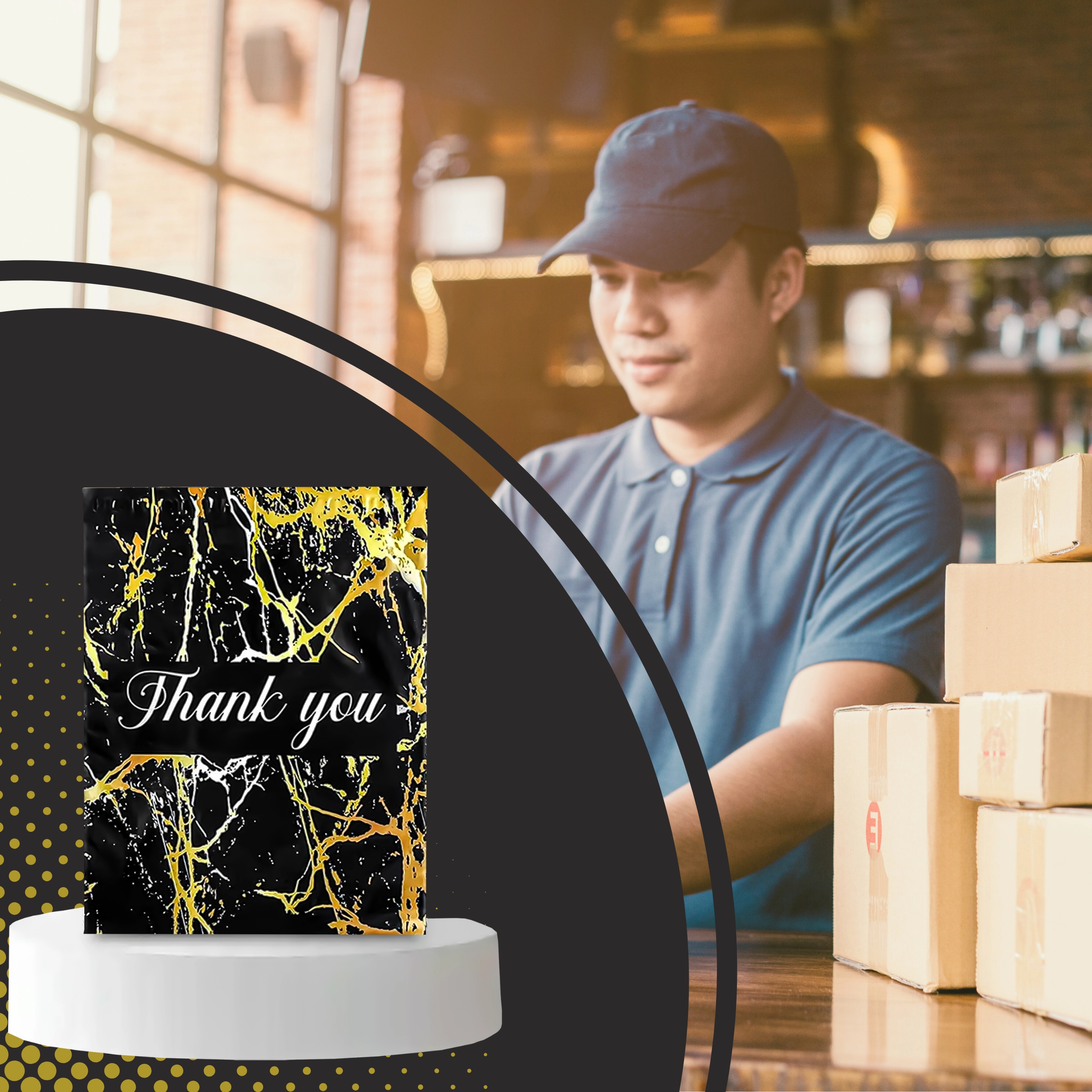 Megbízható csomagolási megoldást keres a küldeményeihez? Ezek a futár fóliatasakok egyesítik a tartósságot, a biztonságot és a professzionális megjelenést. A matt fekete felület arany márvány mintával és Thank You köszönőfelirattal reprezentatív hatást kelt, és erősíti a vásárlási élményt.