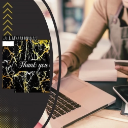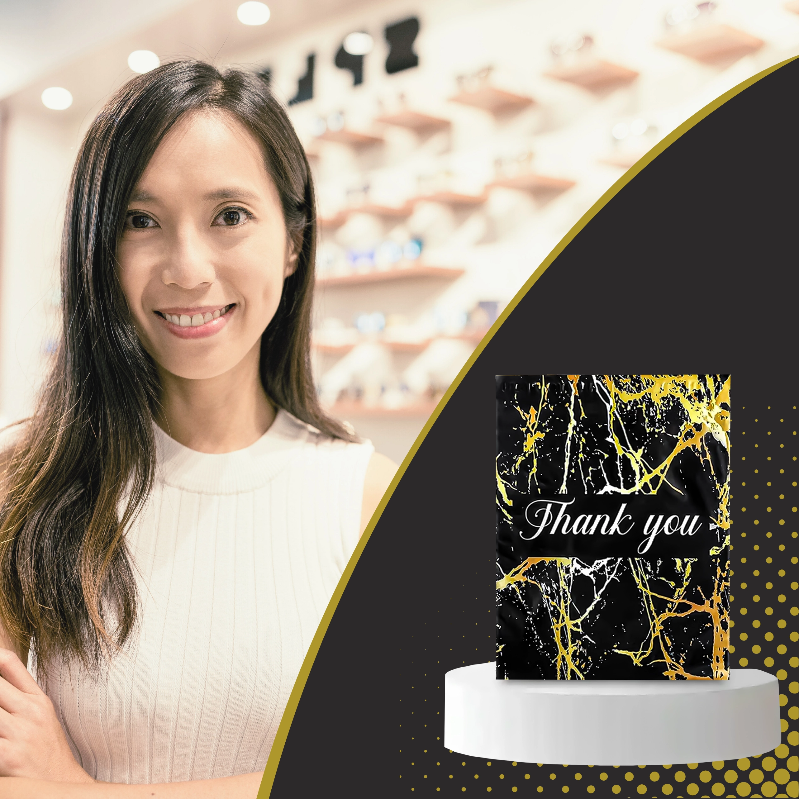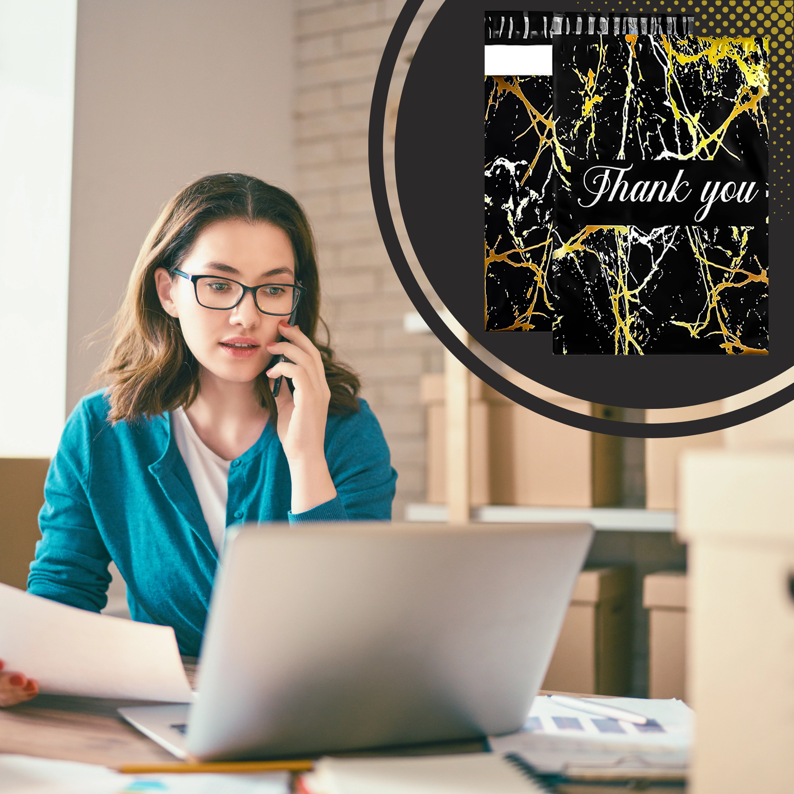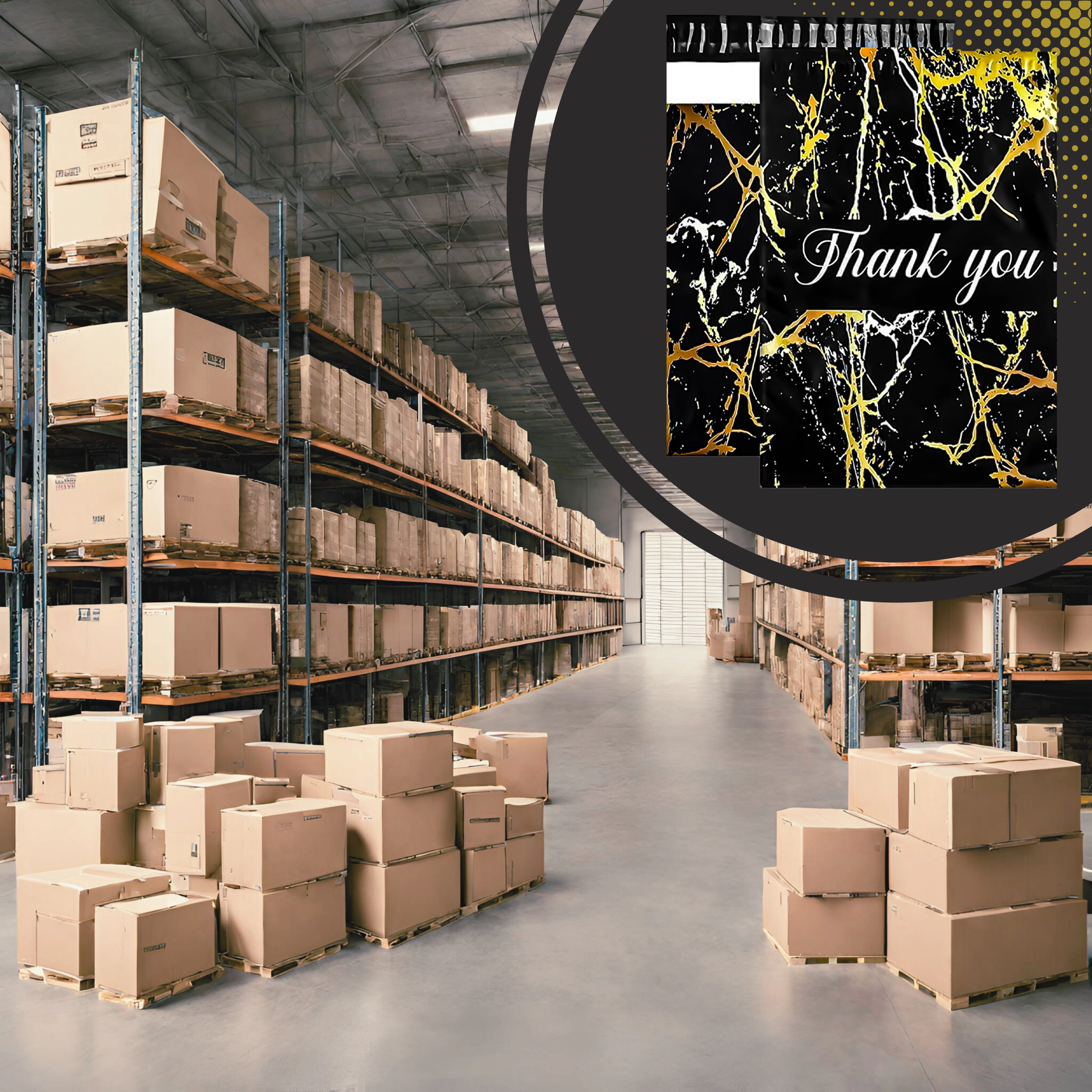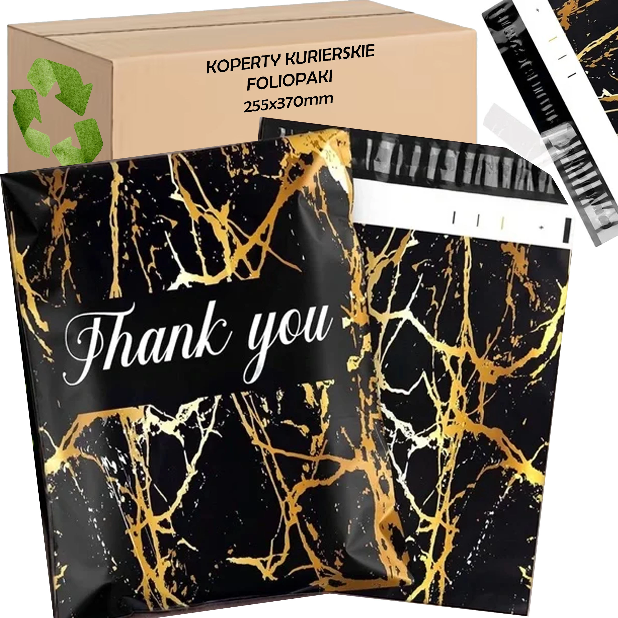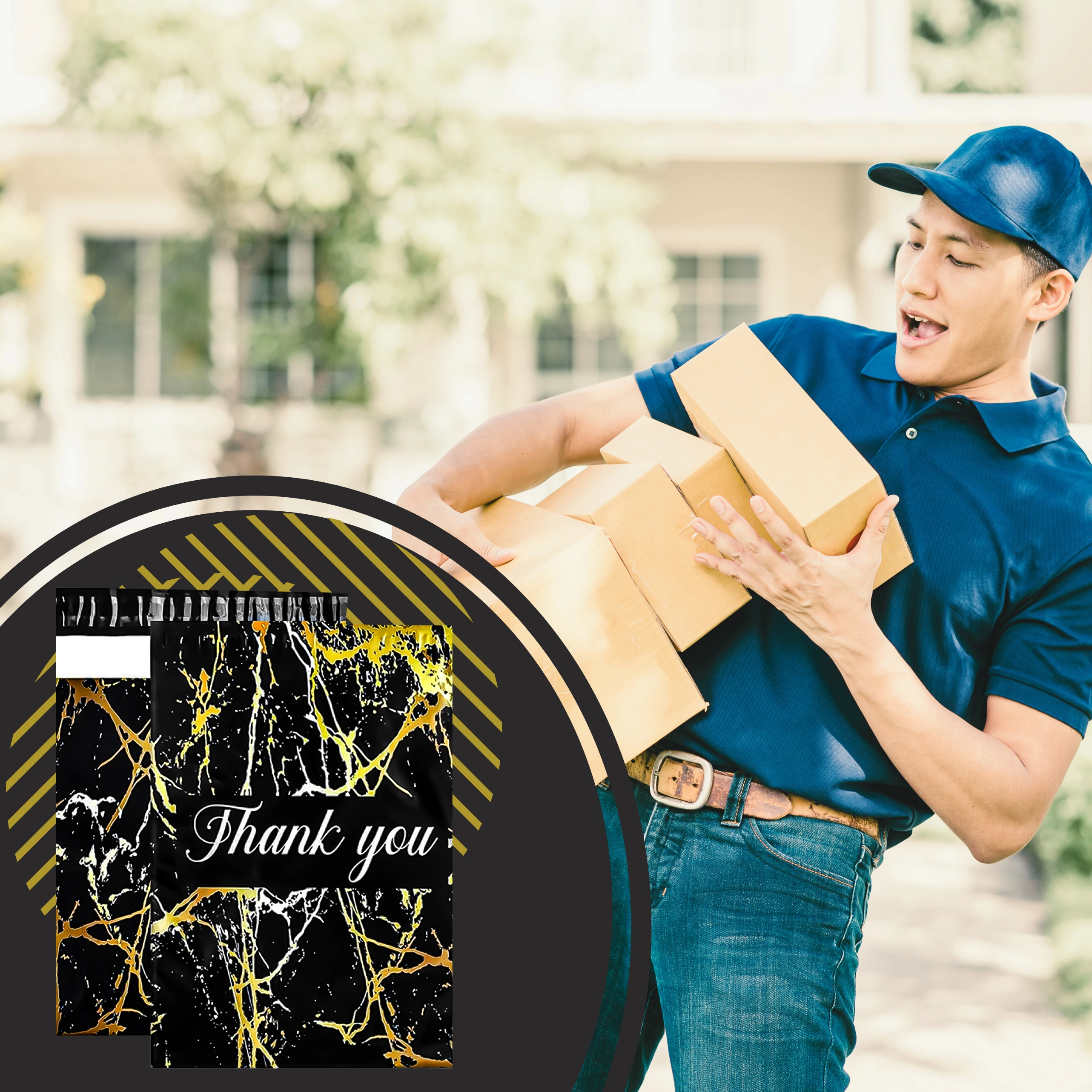 Megbízható csomagolási megoldást keres a küldeményeihez? Ezek a futár fóliatasakok egyesítik a tartósságot, a biztonságot és a professzionális megjelenést. A matt fekete felület arany márvány mintával és Thank You köszönőfelirattal reprezentatív hatást kelt, és erősíti a vásárlási élményt.