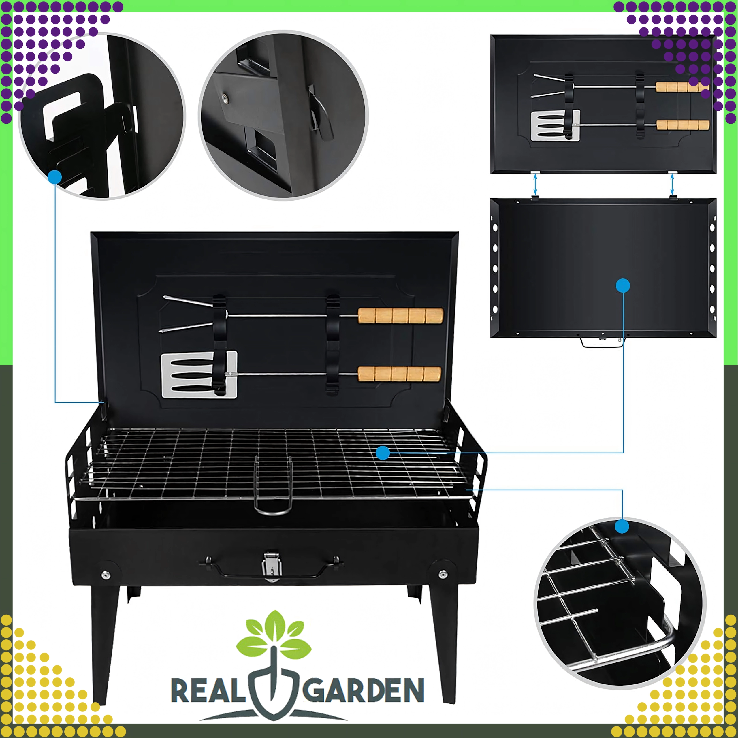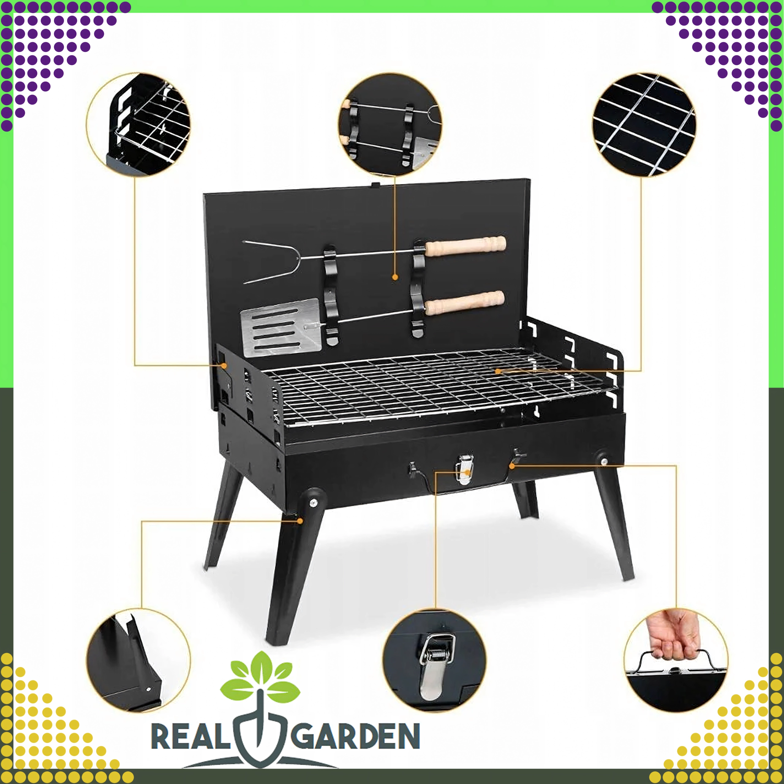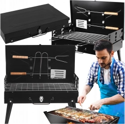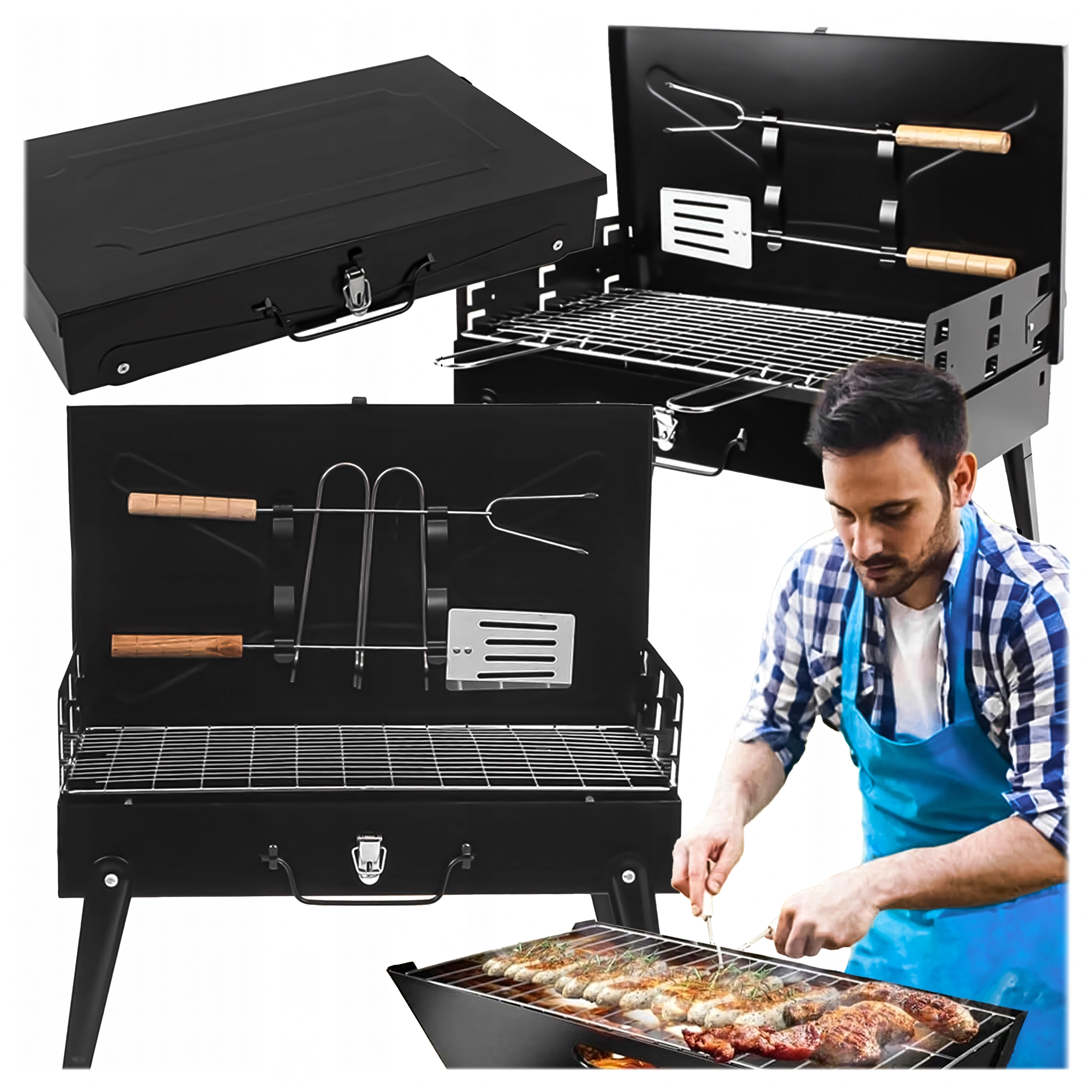 Élvezze a grillezést bárhol ezzel a összecsukható és hordozható faszenes grillsütővel, praktikus bőrönd formájú kivitelben. Gyors összeszerelés szerszámok nélkül, stabil konstrukció és kompakt méretek 44 × 27 × 47 cm – ideális választás kempinghez, kertbe és piknikre. A csomag része a rost és az alap grillszerszám-készlet (lapát, fogó, nyárs). A szellőzőnyílások hatékonyabb égést és gyorsabb ételkészítést biztosítanak.