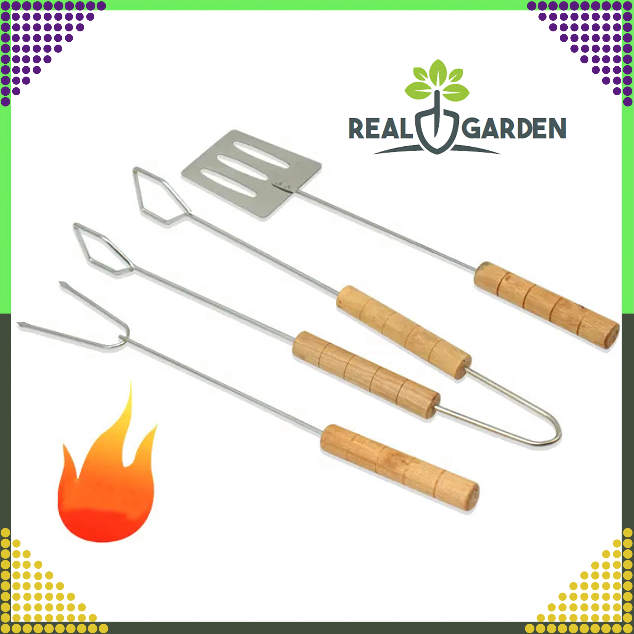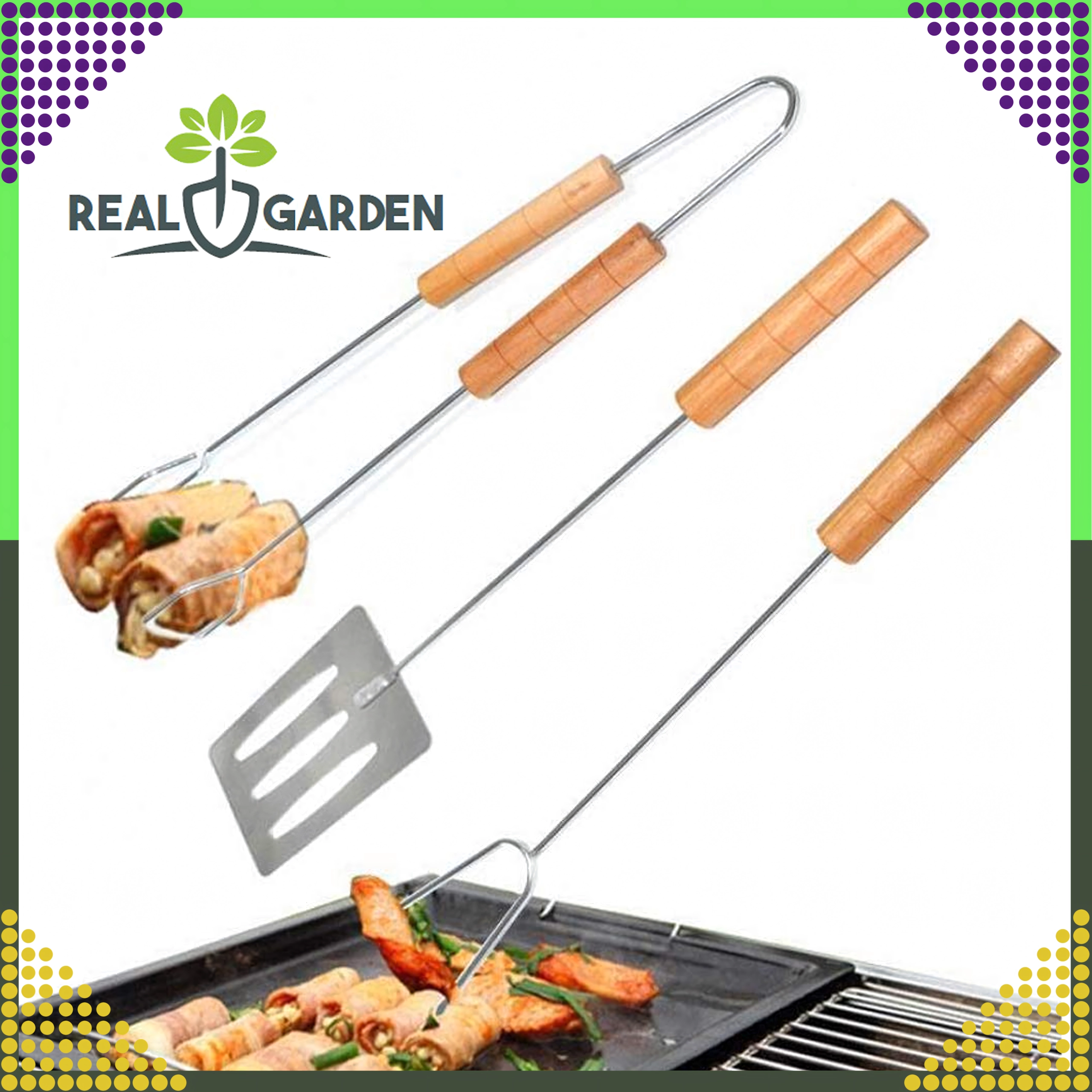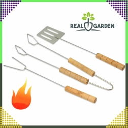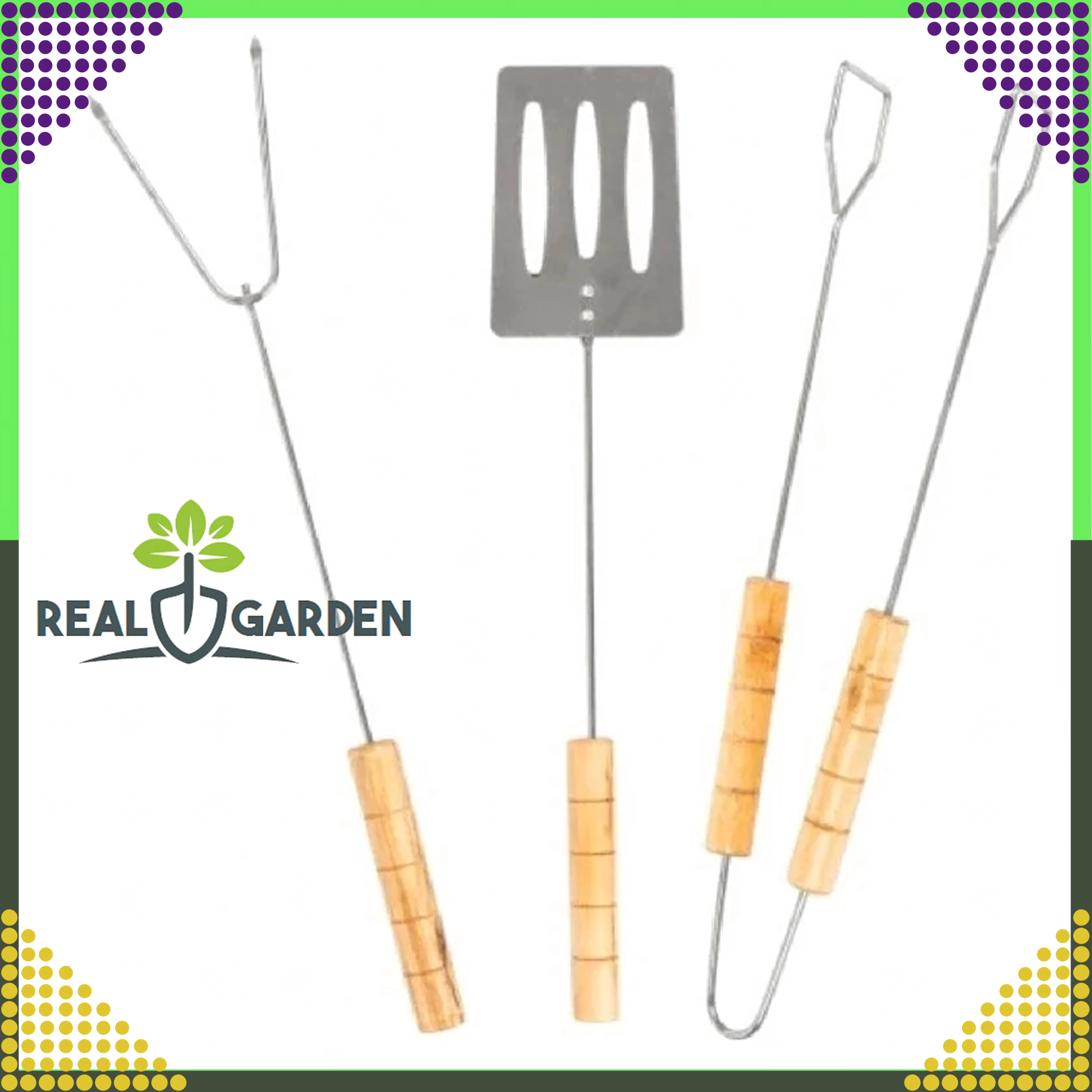 A praktikus 3 az 1-ben grillező eszközkészlet örömmé tesz minden grillezést. Tartalmaz fogót, lapátot és villát rozsdamentes acélból, kényelmes fa nyéllel a biztos fogásért és a biztonságos kezelésért hús és zöldség készítésekor.