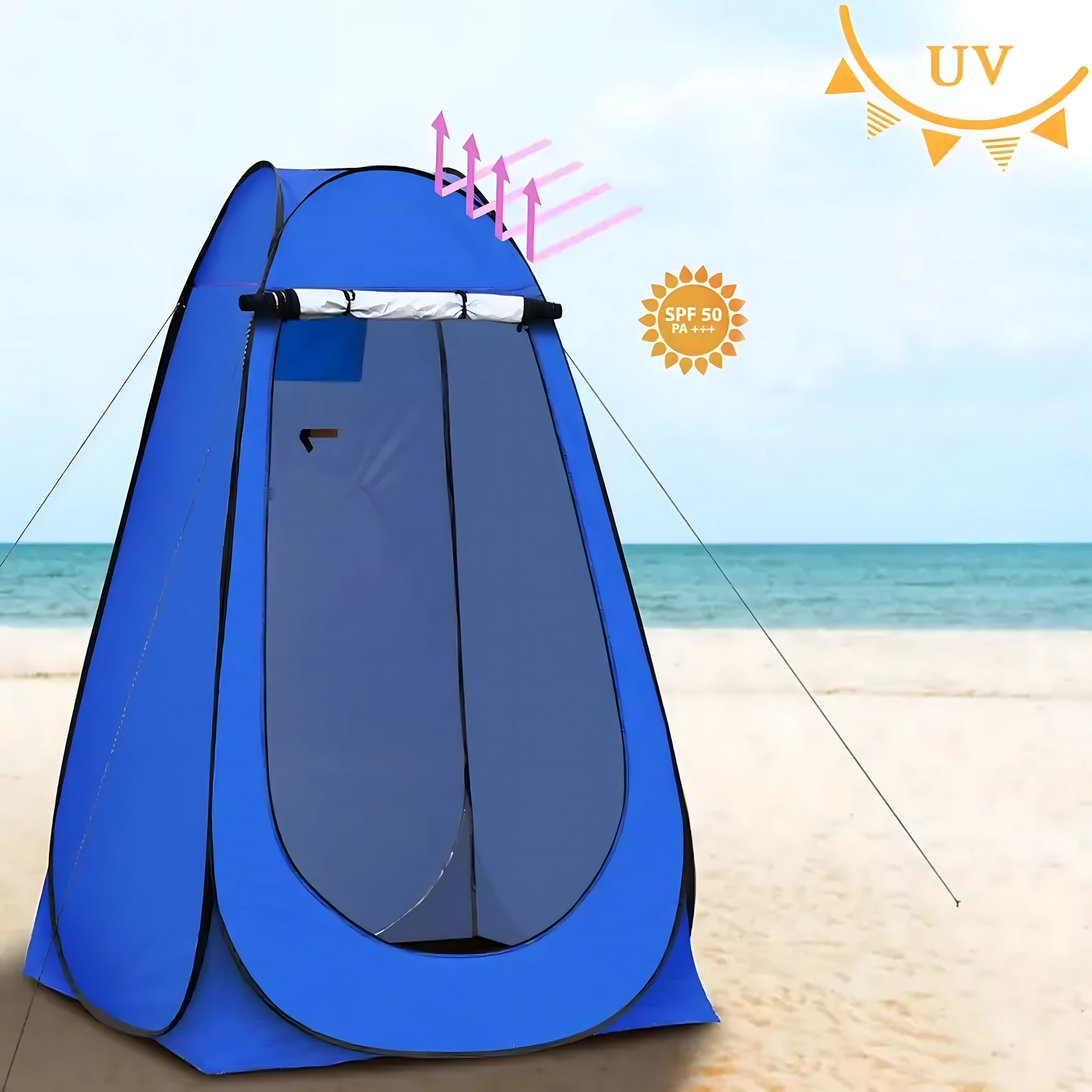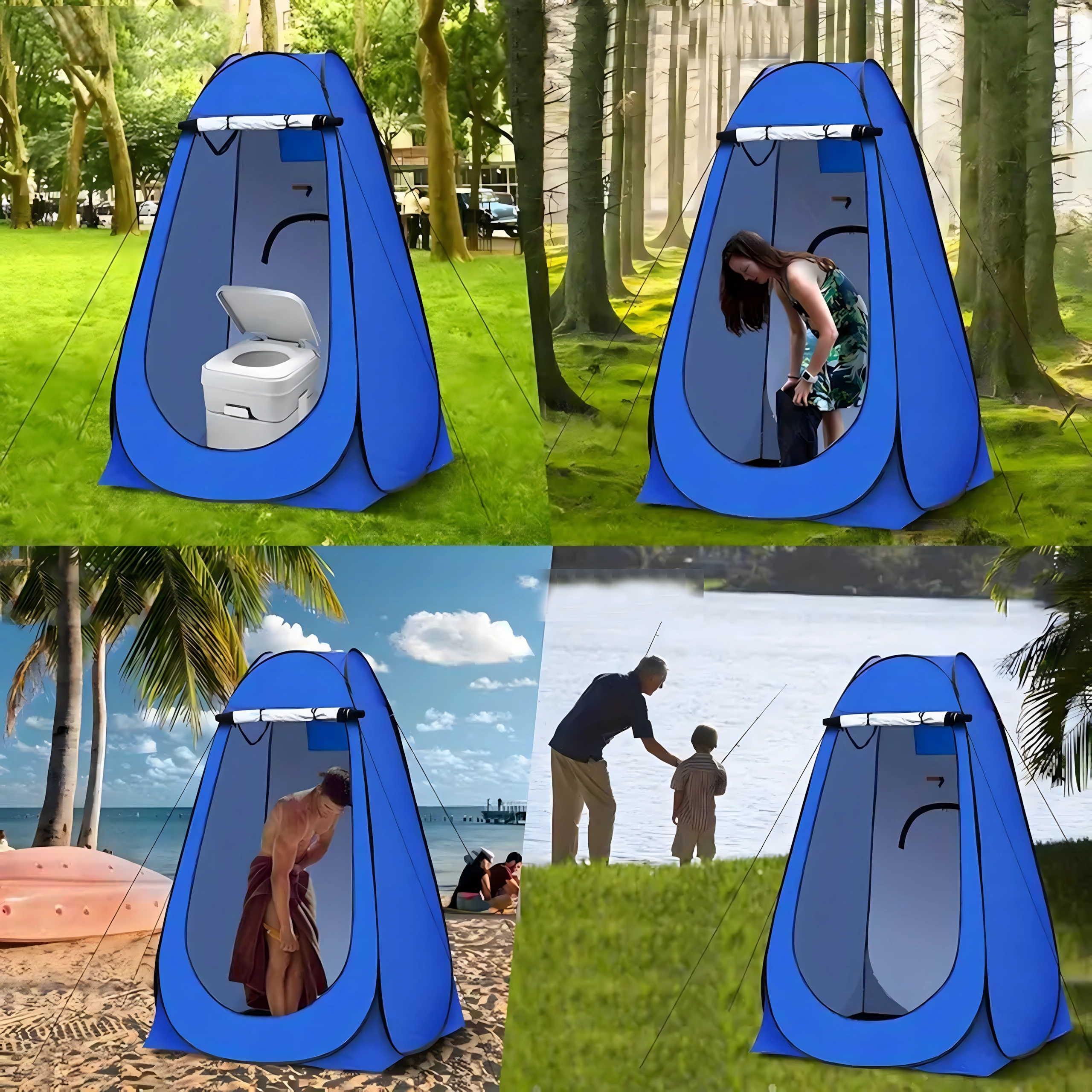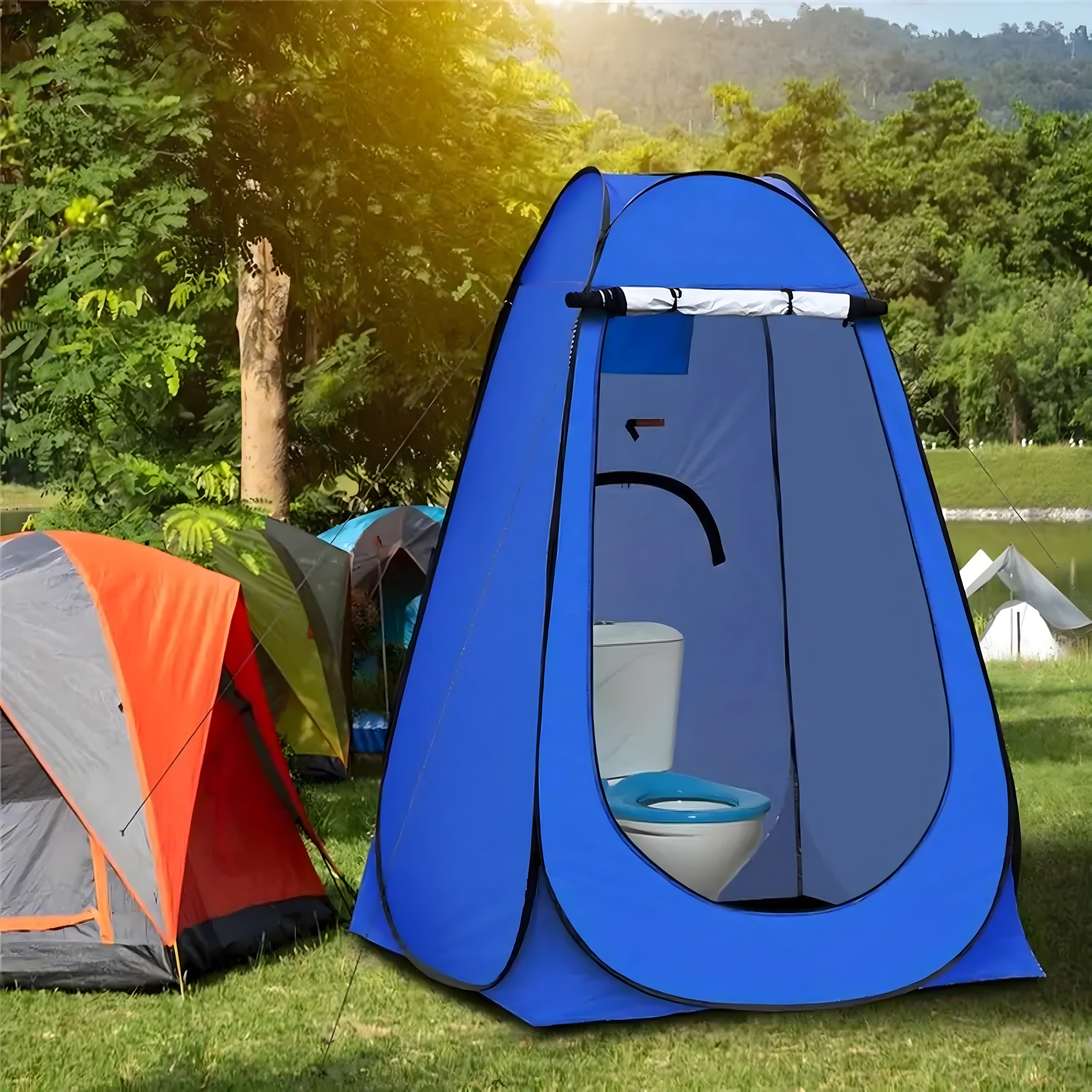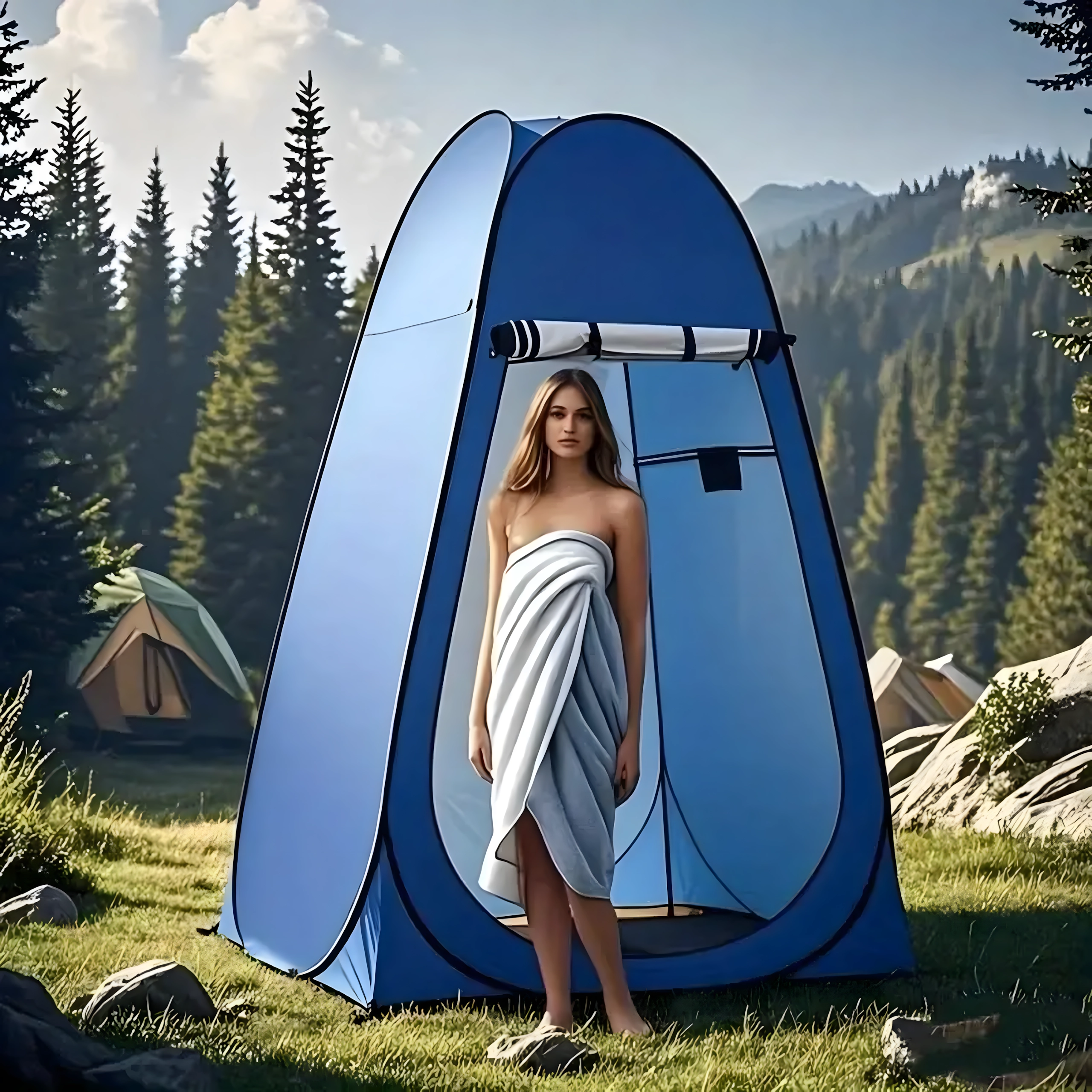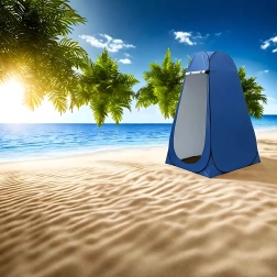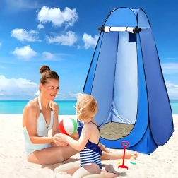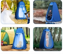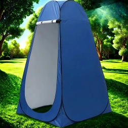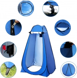 Ez a pop-up sátor megbízható privát teret biztosít átöltözéshez, zuhanyzáshoz vagy hordozható toalett használatához. A stabil szerkezet lehorgonyzó szemekkel és kötelekkel szélben is biztonságos felállítást nyújt, míg a szellőzőablak és a vízlepergető szövet növeli a kényelmet.