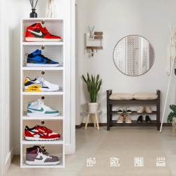 A moduláris rendszer biztonságos egymásra rakást tesz lehetővé, így pontosan a térhez igazodó polcrendszert alakíthat ki. A doboz lapra összecsukható, ezért ha épp nincs rá szükség, nem foglal helyet. Alkalmas sportcipőkhöz, körömcipőkhöz és gyerekcipőkhöz is, és jól illik a modern enteriőrbe.
