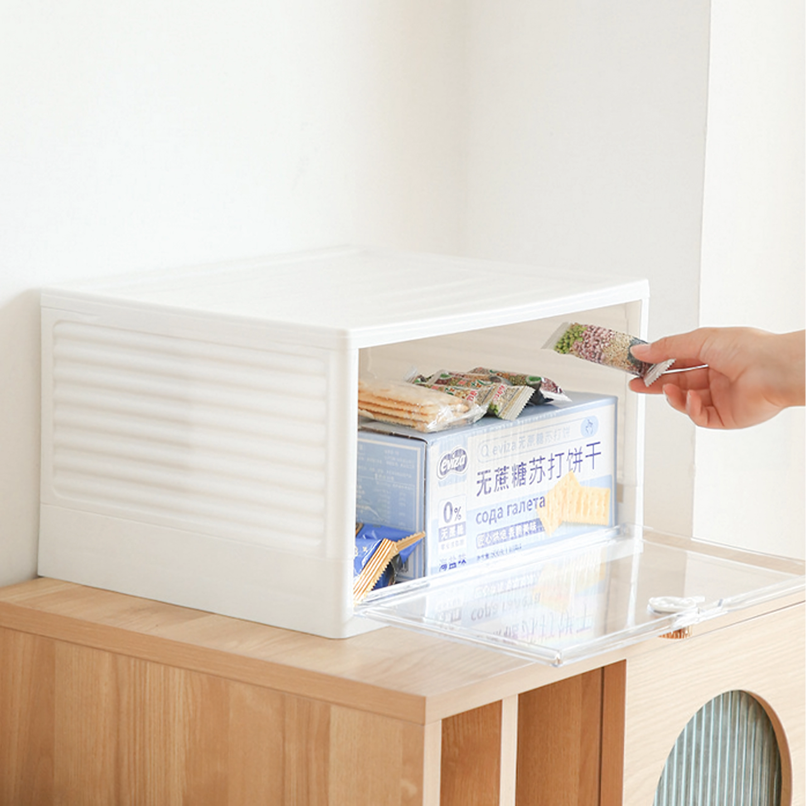 A lehajtható előlap kerek fogantyúval megkönnyíti a nyitást, és azonnali rálátást biztosít a tartalomra anélkül, hogy a dobozt ki kellene húzni a szekrényből.