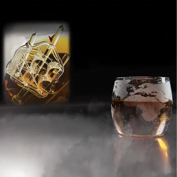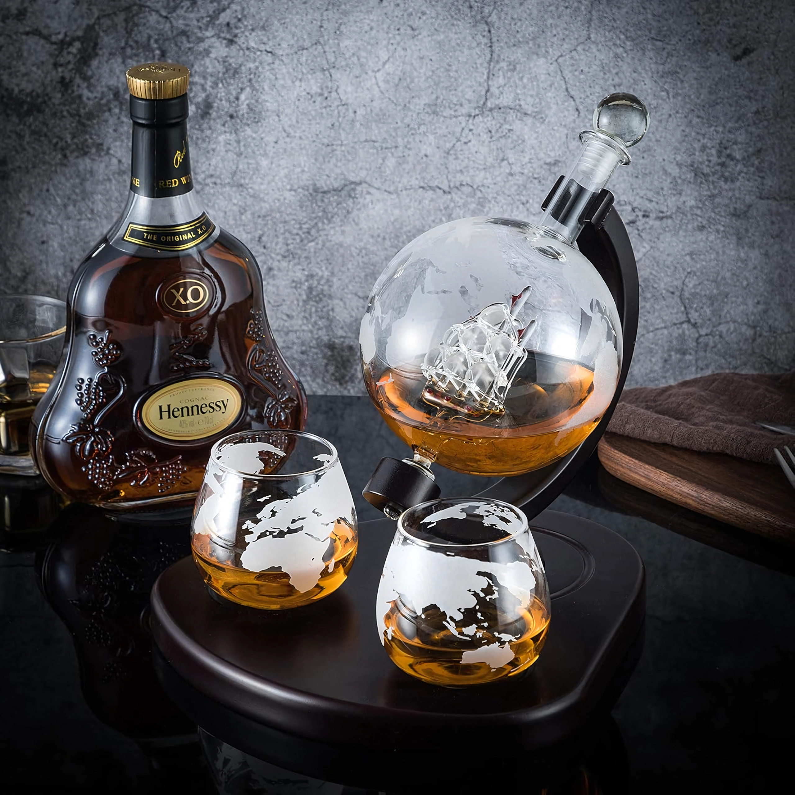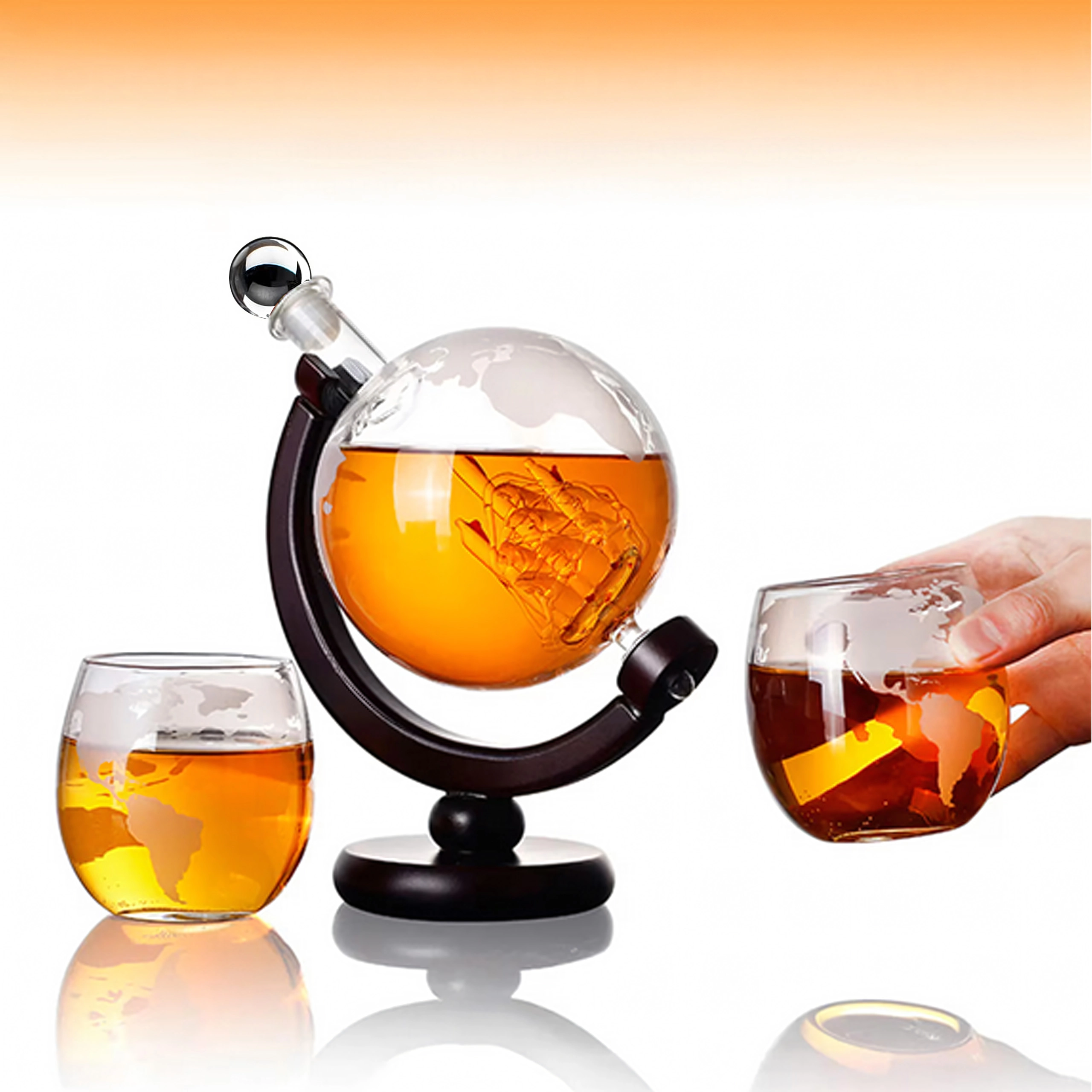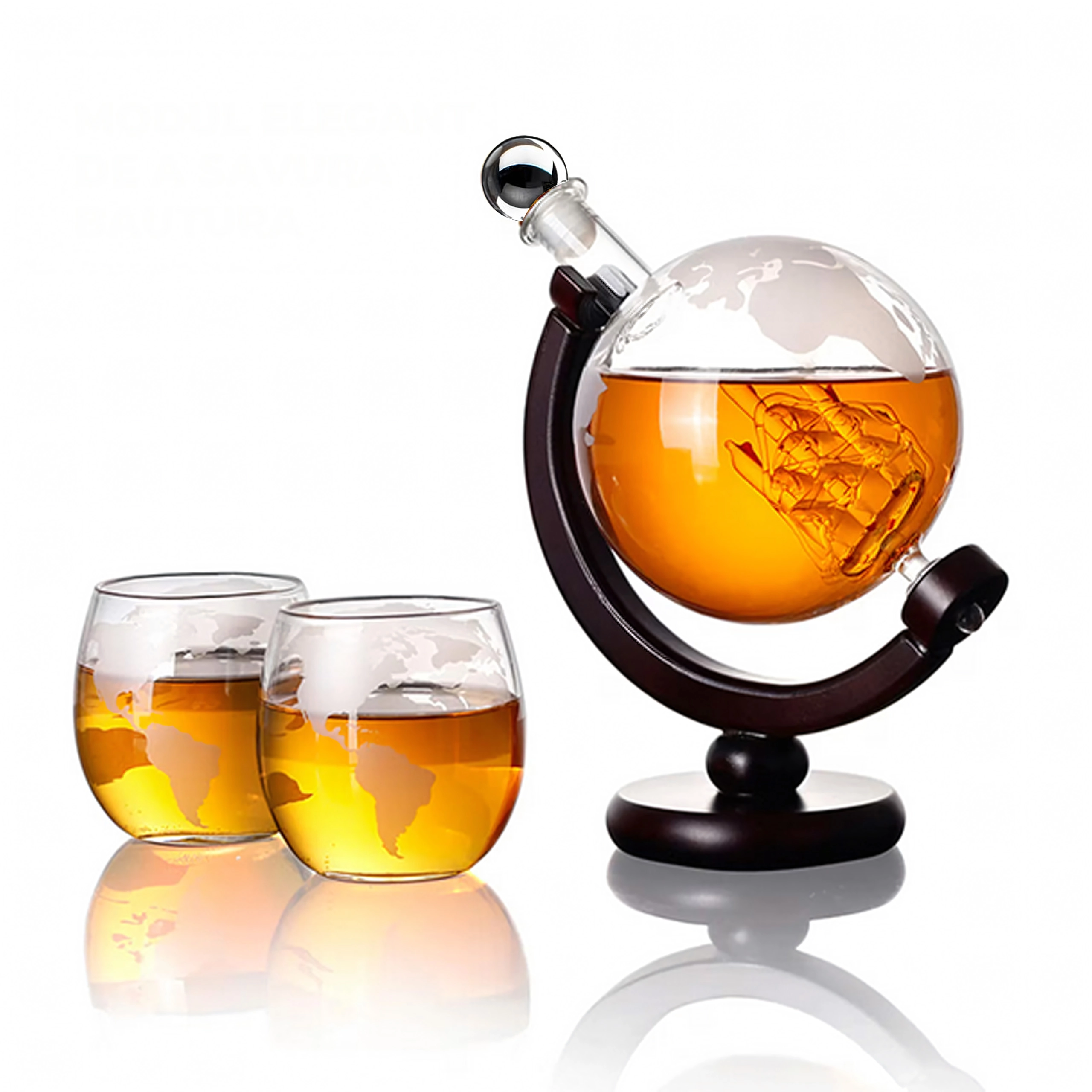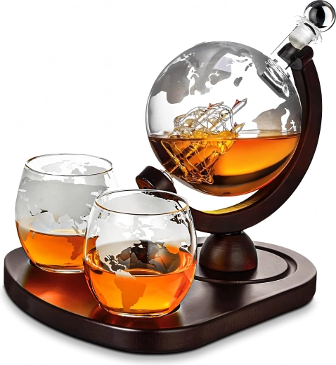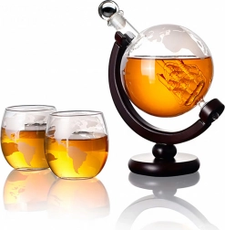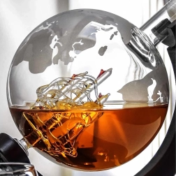 Stílusos szett a párlatok kedvelőinek: üveg karafa földgömb formában, belül hajóval, valamint két pohár térkép motívummal. Elegáns megjelenés, kényelmes kiöntés és reprezentatív ajándék bármilyen alkalomra.