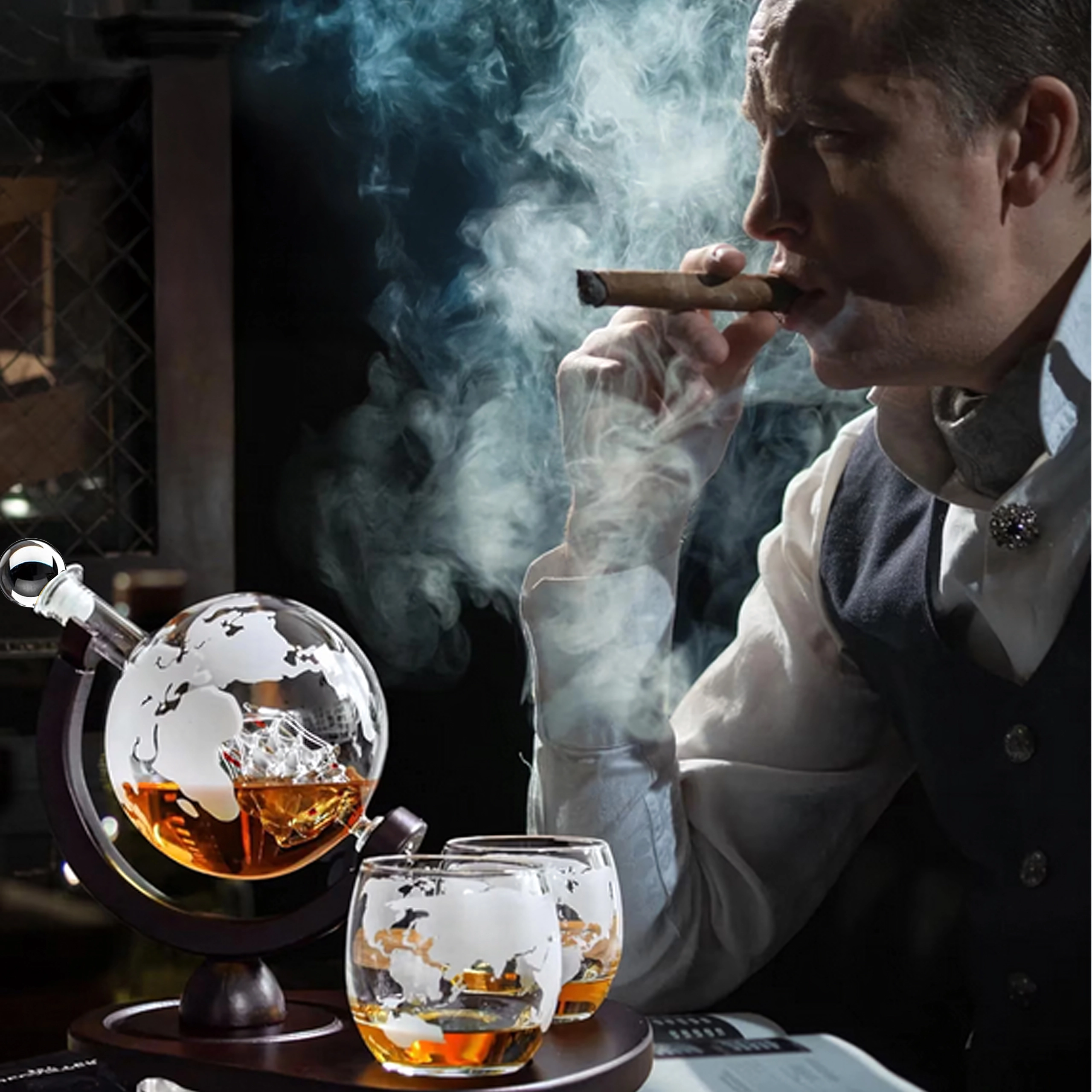 Fedezze fel a dizájn és funkcionalitás egyedülálló ötvözetét. A 850 ml-es karafa sötét fa állványon kapott helyet, amely kényelmes döntést és szervírozást tesz lehetővé. A belső üveg hajó és a finoman vésett világtérkép motívum luxus karaktert ad a szettnek.
